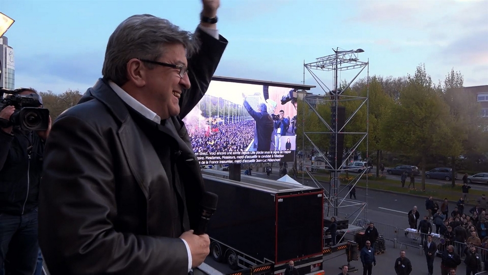 L’une des séquences significatives du documentaire le montre dans l’émission C à vous, où les chroniqueurs l’interrogent tous sur son manque de sang-froid. Déçu d’être attaqué sur sa propre personne plutôt que sur son programme politique, Jean-Luc Mélenchon quitte le plateau dépité, accusant les journalistes de tous ses maux. Il fallait s’en douter, le film de Perret montre ici un Jean-Luc Mélenchon bien moins sûr de lui qu’il ne le paraît lorsqu’il entre dans l’arène. Cependant, désireux de rompre avec l’image caricaturale et bestiale des hommes de gauche, bonnet rouge sur la tête, bouteille de vin dans la poche et poing levé au ciel, Mélenchon s’installe dans le modernisme… et dans la mise en scène de sa personne et de ces discours, notamment grâce à ses « multi-meetings » en hologrammes, qui ont eux aussi marqué cette campagne. Rares, depuis de Gaulle, sont les hommes et les femmes politiques ayant compris l’importance décisive de la mise en scène pour asseoir leur aura, leur autorité et leur statut de futur(e) président(e) de la République.