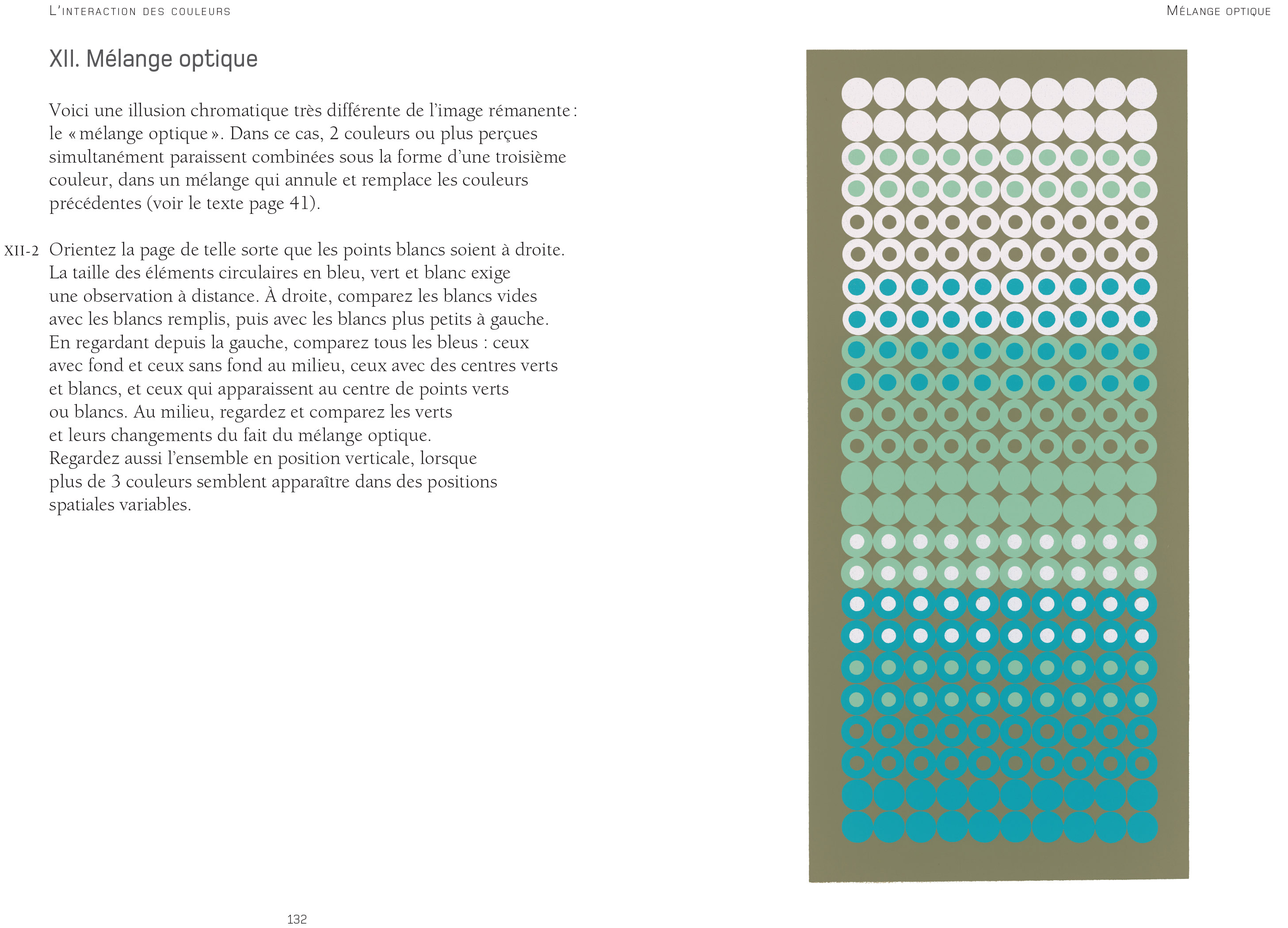 Il met également en avant les illusions d’optique, démontrant que notre perception peut dépendre de notre état d’esprit, de la lumière et des conditions environnantes, mais aussi des couleurs autour de celles que l’on observe. Et c’est là toute la richesse de l’interaction. La même couleur, nous la voyons différemment selon le fond sur laquelle elle se trouve.