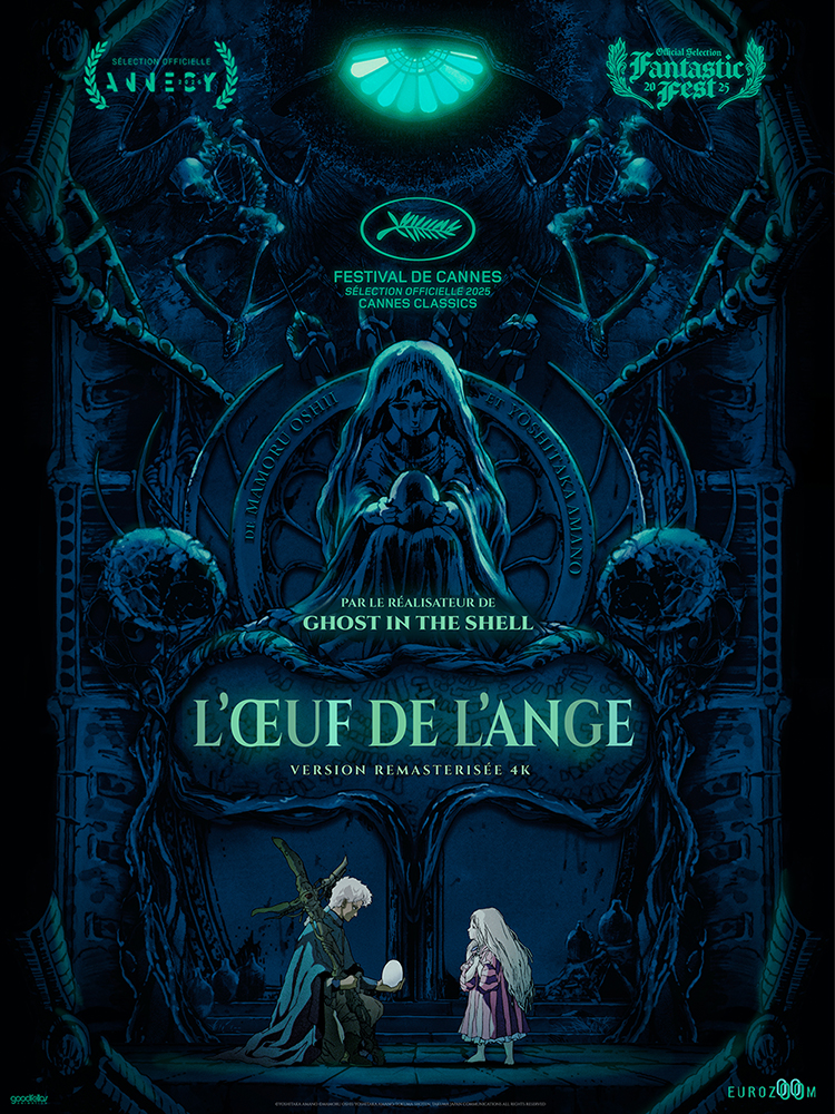 Critique : Il aura fallu attendre son quarantième anniversaire pour que L’Œuf de l’ange soit projeté pour la première fois dans les salles françaises, à la faveur de sa restauration en 4K sous la supervision de son réalisateur. Bien que déjà connu des spécialistes de l’animation japonaise et du public des festivals, il n’avait jamais été distribué en France : initialement conçu comme une OAV (Original Animation Video), autrement dit un film d’animation destiné à être diffusé en cassette vidéo, il n’avait de fait guère rencontré de succès dans l’archipel nippon, au point qu’il avait failli, si l’on en croit le témoignage de Mamoru Oshii, compromettre sa carrière.