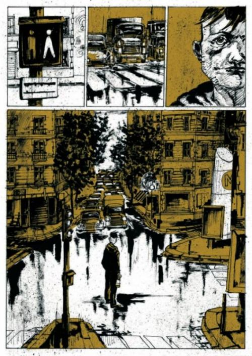 Le dessin réaliste des personnages est parfois dérangeant, car il nous arrive souvent de ne pas être sur de reconnaître quelqu’un. Les visages expressifs ont la capacité de varier parfois d’une page à l’autre. Les décors également réalistes tranchent avec le véritable Lyon par le choix des couleurs. Godart a dessiné sa BD en noir, blanc et ocre. Mais en pus de cela, il ponctue son trait de points, de sortes de salissures volontaires qui renforcent l’aspect étrange de ce récit. Ce choix, poussé à l’extrême, crée parfois une sorte de brouillard, mental ou réel qu’importe. Ce choix se remarque d’autant plus qu’il n’est pas présent tout le temps et qu’il est travaillé à différents degrés. La couverture donne d’ailleurs une idée assez nette du style de dessin choisi.