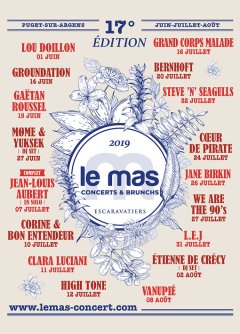 Cette année encore, une programmation variée est proposée aux spectateurs, puisque le festival ouvre ses portes le 1er juin avec Lou Doillon et les referme le 8 août avec Vanupie. Entre ces deux événements se succéderont Groundation, Gaëtan Roussel, Mome et Yuksek, Jean-Louis Aubert, Corine et Bon Entendeur, Clara Luciani, High Tone, Grand Corps Malade, Bernhoft, Steve’n’Seagulls, Coeur de Pirate, Jane Birkin, We are the 90’s, L.E.J, Etienne de Crécy.