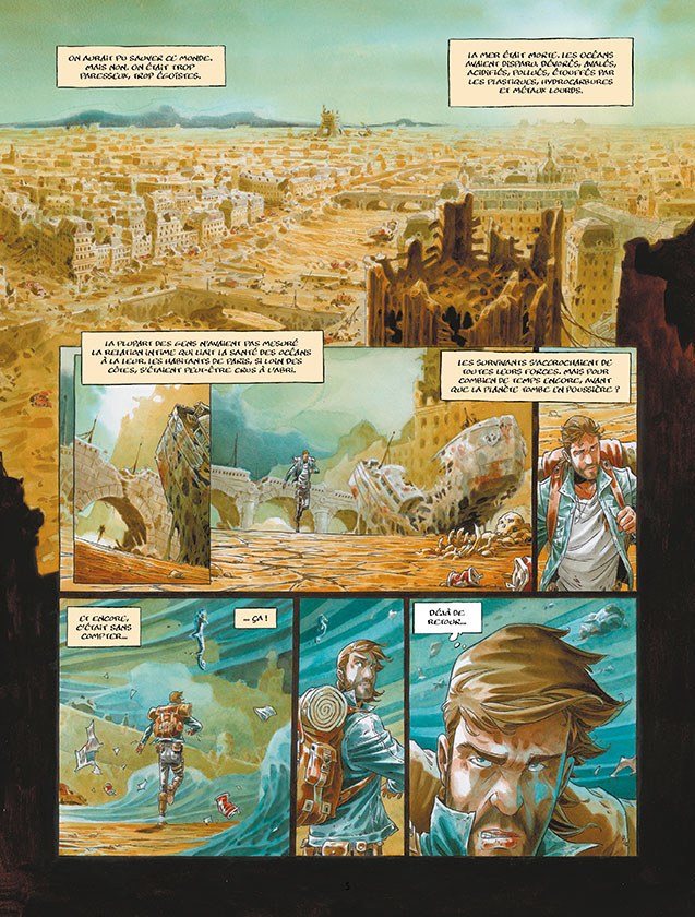 Le dessin apporte une vitalité impressionnante à ce récit. Angoisse crépusculaire d’un monde qui disparaît, et pourtant, les images sont vraiment vives, puissantes. Le graphisme semi-réaliste, le travail des volumes, les décors précis, comme cet opéra Garnier à l’abandon, ajoutent de la force à ce récit. Sans oublier le travail des couleurs, des nappes d’aquarelles qui se mêlent, se fondent, sur les personnages autant que sur les décors, rendant les lumières explosives, le soleil écrasant. Et surtout ces flots venant des ténèbres qui éclatent d’un bleu puissant. Olivier Boiscommun réalise là un travail magnifique, qui rehausse l’histoire déjà originale.