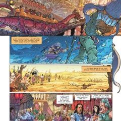 L’énergie est autant dans la course pour sauver le monde que dans les dessins explosifs de Dana Dimat. Les personnages si expressifs sont toujours en mouvement, même pour s’écrouler endormis comme la princesse Lythek. Cette épopée n’est pas baroque pour rien, créatures intrigantes, personnages déjantés, costumes chatoyants, tout est là. Et les couleurs de Stefania Aquaro contribuent fortement à cet éclat !