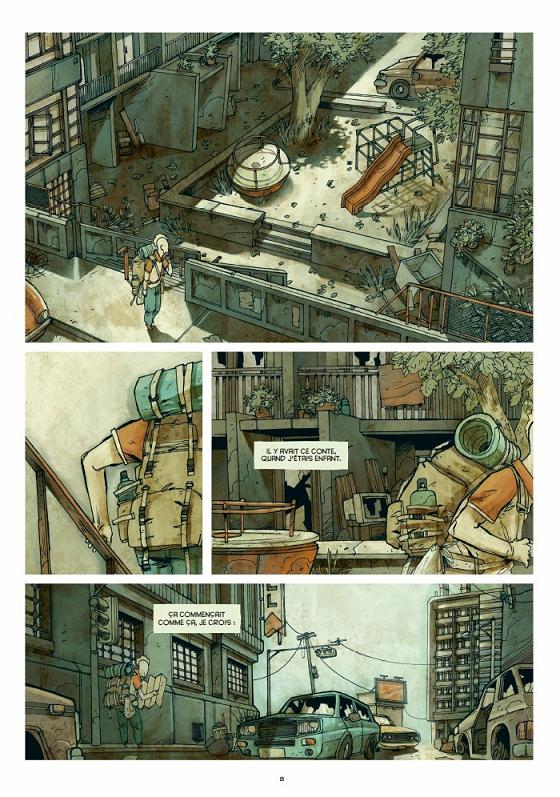 Mathieu Bablet sait mettre en avant cette ville ruinée, abandonnée, dévastée, où errent un homme seul. Bien sûr,il ne restera pas seul longtemps. Et petit à petit, se dessinent les caractères des quelques personnages que nous allons côtoyer pendant ce périple. Car il s’agit bien d’un périple. Il faut survivre, trouver à manger dans un monde dépourvu d’habitants. Nos héros se débrouillent avec des conserves. Mais comme le signale l’un d’entre eux, leur vie risque fort de s’arrêter avec la date de péremption des boîtes de conserve.