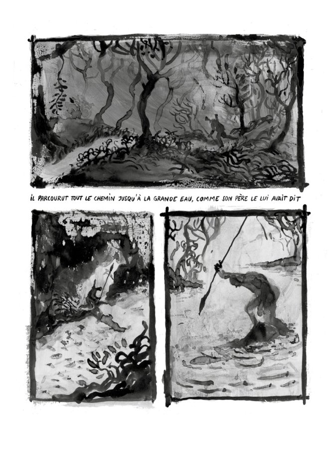 En soixante pages, l’artiste espagnol Alberto Vazquez (également auteur de Psychonautes) brosse une allégorie puissante au message profondément pessimiste qui met en évidence les écueils de la modernité. Le dessinateur met d’abord en scène l’homme primitif dans sa confrontation avec une nature dangereuse, qui chasse pour sa survie. Fil rouge du récit, la traque du cerf conduit l’homme loin dans la forêt : cet éloignement géographique constitue une métaphore habile pour figurer le passage du temps, puisque dans cette histoire poétique, l’homme prend conscience de lui-même, découvre les croyances, la guerre jusqu’à se confronter au monde contemporain dont l’auteur fait une peinture extrêmement noire. Ce sombre destin semble inéluctable, comme le laisse présager le narrateur lorsque l’homme s’observe dans la rivière et voit son squelette en lieu et place place de son reflet.
