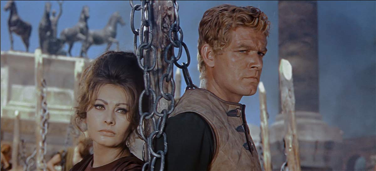 Le premier souhaite régler les conflits politiques par la négociation et la liberté pour les peuples annexés se rebellant, quand le second, qui règnera un temps après la mort de son père, veut utiliser la force, et se révèle comme un dictateur mégalomane et sanguinaire. Un autre personnage va jouer un rôle clef : il s’agit de Lucilla (Sophia Loren), la sœur de Commode qui est éprise de Livius, mais que l’on marie au roi d’Arménie (Omar Sharif). Si la réalité historique est quelque peu malmenée (mais cela n’est en rien un problème dans une fiction de cinéma), le film privilégie les scènes de dialogues intimes, faussement shakespeariens, et qui sont préférées aux rares séquences d’action et de combat, à l’instar de la Cléopâtre de Mankiewicz, auquel on peut le comparer, mais qui nous semble plus réussi. La chute de l’Empire romain a pourtant de réelles qualités, à commencer par le soin technique appréciable notamment avec la photo de Robert Krasker et les décors de Venerio Colasanti et John Moore. Ces derniers ont reconstitué le forum romain, l’un des plus gigantesques décors de cinéma, de 437 mètres de long sur 251 de large, et le résultat est vraiment impressionnant en CinemaScope.