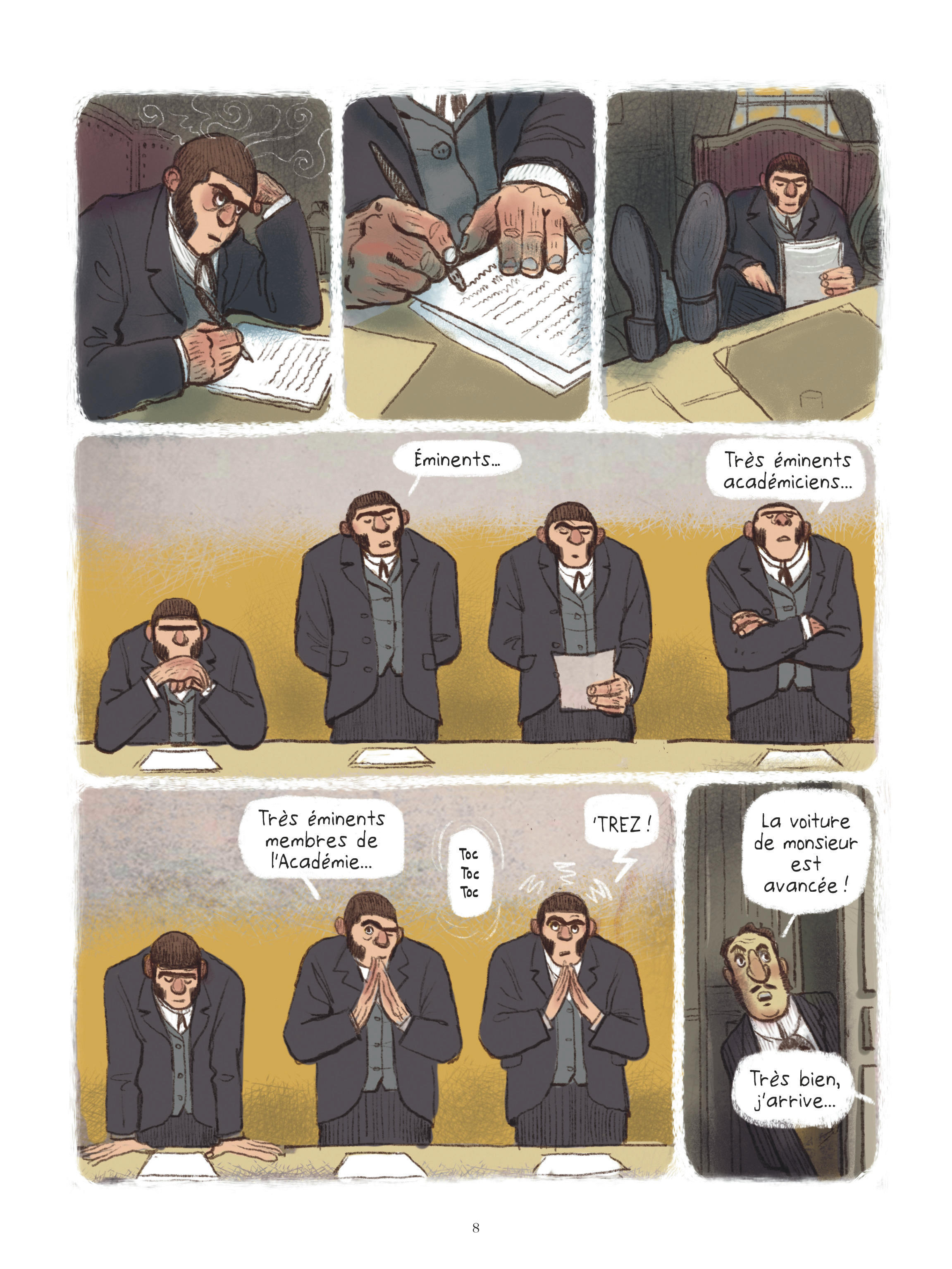 Critique : Tiré d’une nouvelle de Franz Kafka, cet album alterne le déroulement de la conférence et le contenu de celle-ci, des retours en arrière donnant à voir ce que raconte le singe devenu homme. Le récit ne cesse donc pas de sauter du présent au passé, du fait accompli à son déroulement, du changement de condition établi à ce qui y a conduit… Ces allers-retours constants le balisent et lui confèrent une véritable dynamique. Ils contribuent également pleinement à sa dimension ironique, le gorille métamorphosé en humain racontant comment il a appris à effectuer tel geste, acquis telle attitude, revenant sur les situations comme sur les personnes qui l’ont accompagné.