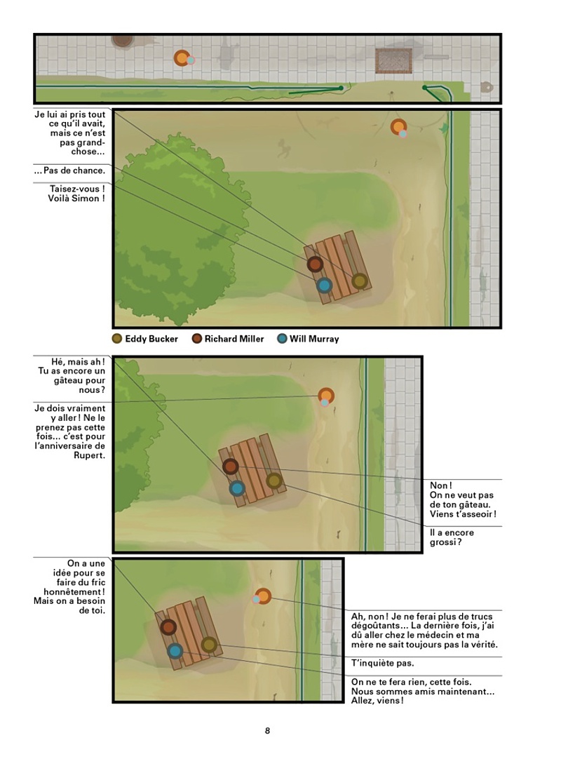 Critique : La couleur des choses est d’abord une expérience de lecture. Réalisé avec des logiciels d’infographie, l’album est intégralement dessiné en vue plongeante et sans perspective : les personnages sont des points de couleur et les décors sont tous vus d’en haut, à la manière des premiers Grand Theft Auto (GTA) dans les années 2000. Ce choix graphique pour le moins étonnant est lié au parcours de son auteur, le suisse Martin Panchaud, artiste souffrant d’une forte dyslexie qui a beaucoup réfléchi à l’interprétation et à la signification des formes. S’il est très éloigné des codes traditionnels de la bande dessinée, Martin Panchaud utilise parfaitement les possibilités du medium, en particulier dans la mise en page. L’agencement de chaque case et de chaque dialogue fait l’objet d’un soin minutieux pour que l’œil du lecteur ne se perde jamais. Cet art dans le découpage n’est pas sans faire penser aux œuvres de Chris Ware.
