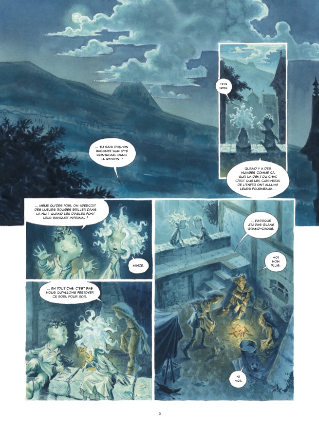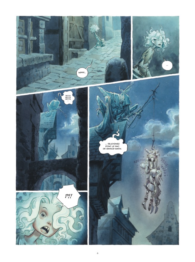 Critique : La cuisine des ogres mobilise à plein l’imaginaire associé à cette figure traditionnelle qui hante les contes pour enfants afin de leur faire peur, dans l’objectif qu’ils soient obéissants et/ou qu’ils ne s’aventurent pas trop loin du domicile familial… L’incipit présente les victimes : des enfants délaissés et victimes du monde des adultes. Ces derniers tombent dans le piège de Grince-Dent, qui fait apparaître sous leur yeux des denrées pour mieux les capturer et les revendre comme ingrédient dans la fameuse cuisine des ogres. Il s’en suit une aventure à rebondissement qui se concentre sur l’astucieuse Blanchette laquelle, loin de se lamenter sur son sort, utilise ses qualités – tout en pouvant compter sur sa bonne étoile – pour survivre dans un monde hostile et étranger. S’il en ressort bien une certaine morale, que l’on laisse au curieux le soin de découvrir, c’est d’abord le monde et la violence des hommes qui est épinglé.