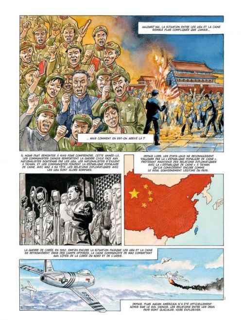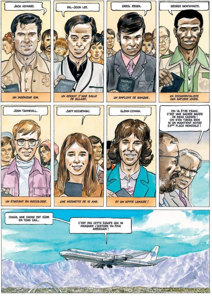 Son autre atout réside évidemment dans son atour graphique, puisque Alain Mounier a livré un album qui se veut d’un style graphique un brin daté, d’un pâleur de polaroïd, mais où les visages et les uniformes respirent la réalité. On est pas loin de protagonistes aux traits que Léo n’aurait pas renié, assez anguleux mais toujours proches de photographies ou de vidéos d’époque, le tout épaulé par quelques cartes, rappels de dates et d’évènements politiques qui nous renvoient quelques cinquante ans en arrière, mais sans brusquerie narrative ou épanchement didactique. La maîtrise est complète, et l’on se laisse aspirer par ces joueurs de ping-pong qui ont rêvé d’une paix... olympique.
