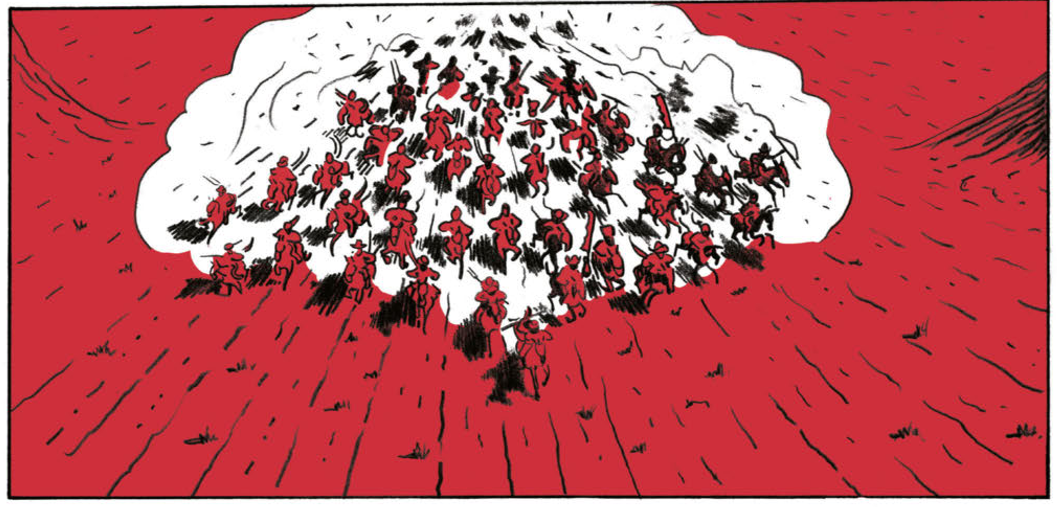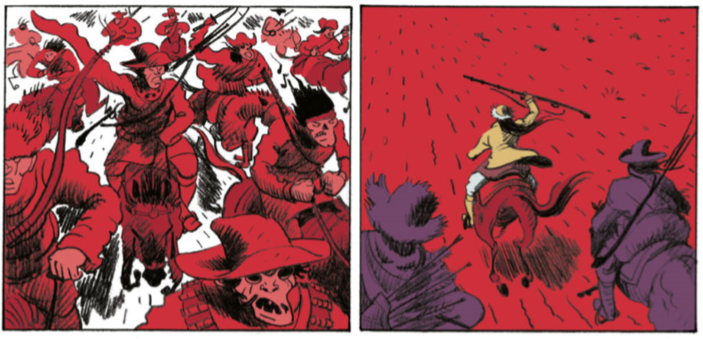 Cependant, le dessin n’obéit pas vraiment à cette logique réaliste, puisque si les décors ont un caractère détaillé, les couleurs se confondent, plaine rouge et montagne bleue, et obstruent cette impression de réel. De même, les personnages ont des mines enthousiastes, comiques, parfois caricaturales, surtout en voyant arriver le vieux sage du conseil, le shaman satyre ou le chef d’une tribu brutale. Les protagonistes, Albertus et Dolma en tête, échappent de peu à ce traitement, notamment la jeune femme, beauté sauvage qui évoquera forcément les balades d’un certain Jonathan. L’ambiance est totalement différente de l’œuvre de Cosey, ici le terme « farce » du titre est bien à propos, et même lorsque la BD s’embarque dans la géopolitique, Verdier le fait avec un trait satirique, évitant l’écueil du trop sérieux.