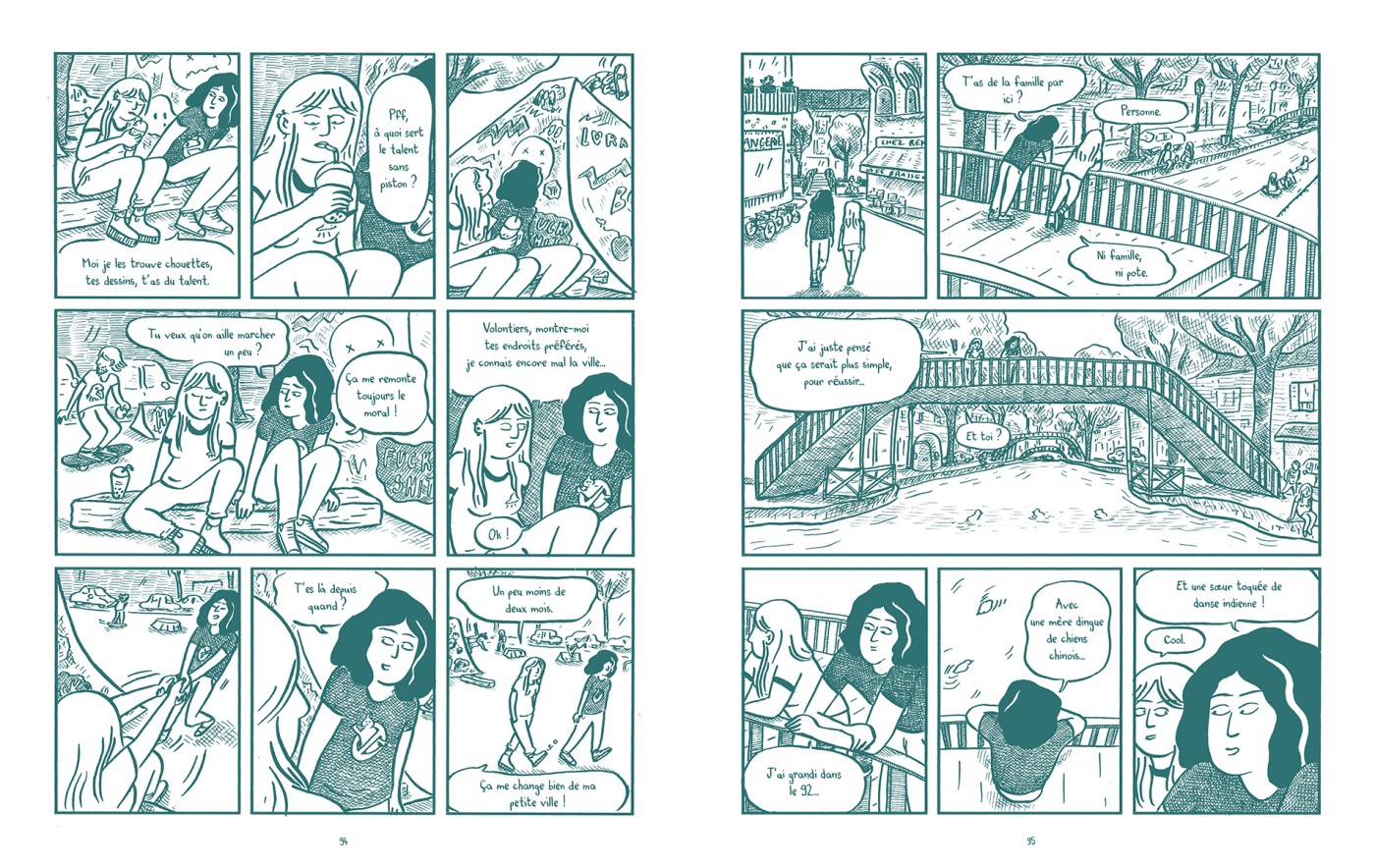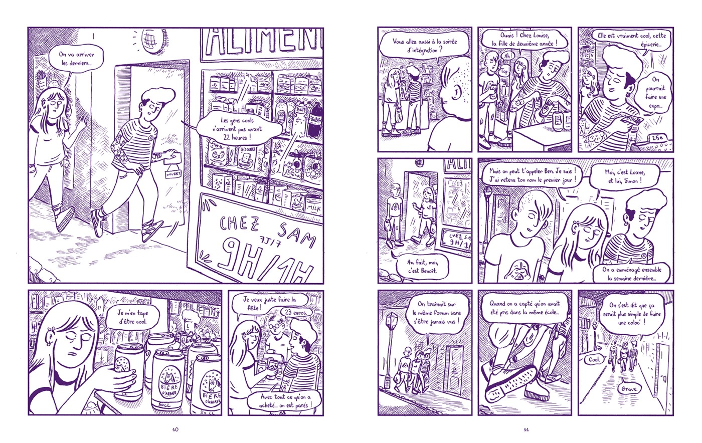 En lisant à quelques jours d’intervalle la réédition du Journal de Fabrice Neau et La fête est finie de Mathilde Payen, on se dit que le roman graphique autobiographique dispose à la fois d’une forte tradition qui perdure avec l’arrivée d’une nouvelle génération pleine de talent. S’il fallait relier les deux œuvres, ce serait assurément par ce vague à l’âme insaisissable qu’entraine la fin des études, ici celles des Beaux-Arts, un cocon loin d’être idéal mais tellement plus accueillant qu’un marché du travail sans pitié avec une vie plus solitaire, sans famille ou groupe d’amis proches. Et l’histoire de Mathilde Payen, a quelque chose d’universel, de terriblement humain et typiquement étudiant. Ce qu’elle décrit c’est une insouciance qui se dissipe, et comme cette impression s’imprime en semaines voire mois, c’est au moyen de souvenirs, pas forcément heureux d’ailleurs, dans un ordre chronologique que l’on peine à discerner, que se conduit cette entreprise possiblement autobiographique. C’est une relation sexuelle dont on a honte, un cours dont on a été viré qui se transforme en après-midi tranquille au parc, c’est un plat de pâtes devant une série, c’est une amie que l’on sent vraie, une somme de nombreuses petites choses sans certitudes qui font une histoire pleine.