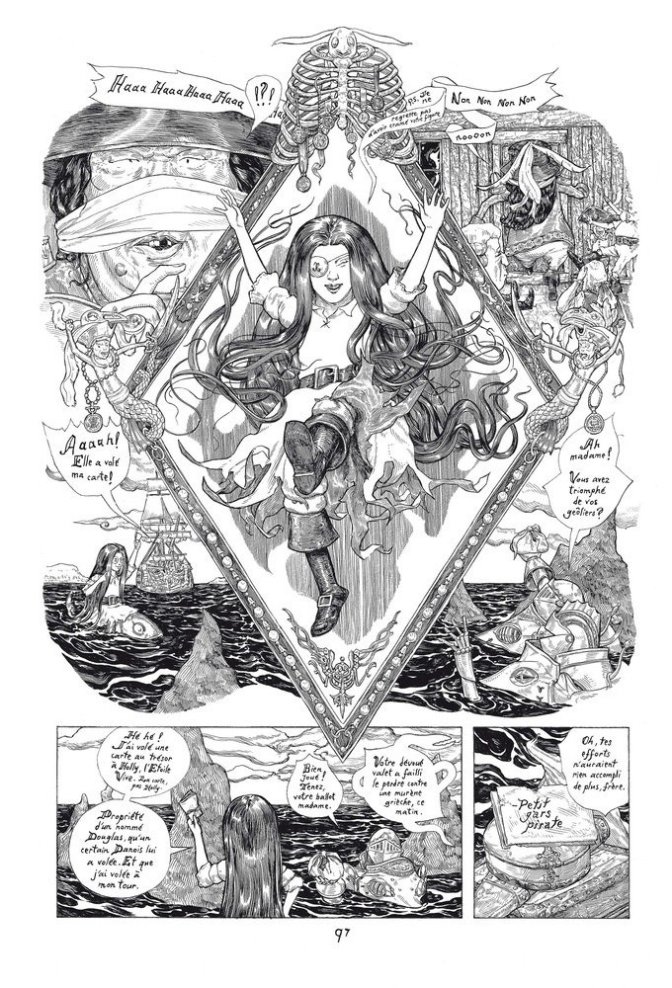 Notre avis : une claque. Magistrale. Il convient tout d’abord de saluer le travail de l’éditeur, les Editions de la Cerise, qui nous offre un album proprement somptueux : papier de qualité, travail sur la couverture..... tout pour remplir d’aise le bibliophile qui sommeille logiquement en chaque fan de BD. Et c’est bien la moindre des choses, ne serait ce que pour le dessin de Jeremy Bastian, truffé de détails, alignant des trognes toutes plus patibulaires les unes que les autres. Les esprits chagrins pourront déplorer qu’un tel étalage de talent, se rapprochant plus de la gravure que du dessin, peut par moments nuire à la lisibilité et à la fluidité de la lecture, mais au delà d’un légitime ébahissement de tous les instants, un tel foisonnement permet au lecteur de s’immerger (c’est le cas de dire) dans ce monde étrange, décalé, truffé de références à la littérature classique (Alice au Pays des Merveilles, Blanche Neige, l’Ile au Trésor, Peter Pan, le Baron de Munchausen.......). Mais ces influences sont toutes parfaitement digérées et c’est un monde à part, inédit, que nous livre Jeremy Bastian. Les coups de sabres et les boulets de canons fusent, comme dans tout bon récit de pirates à l’ancienne, mais le surnaturel et la poésie ne sont jamais loin. C’est à regrets que l’on referme cet album, que l’on quitte cet univers. Heureusement, il ne s’agit que du premier volume. To be continued........