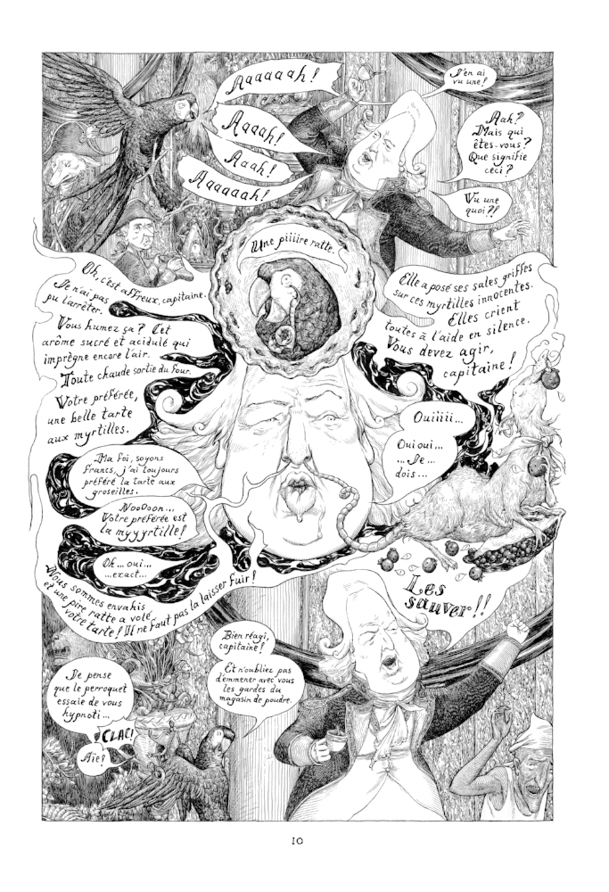 Mais bon sang de bonsoir, que c’est beau !!! Il est normal que l’œil soit attiré de tous les côtés, tellement le dessin en noir et blanc de Jeremy Bastian fourmille de détails, tous plus réjouissants et hallucinants de précision les uns que les autres. Il en semble presque vivant, et on a l’impression qu’à tout moment il cherche, avec plus ou moins de réussite, à s’échapper du carcan de la case traditionnelle pour investir la page entière, pour ne pas dire l’album, voire notre univers.