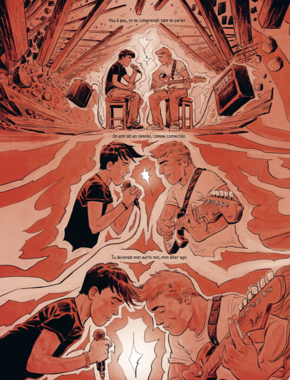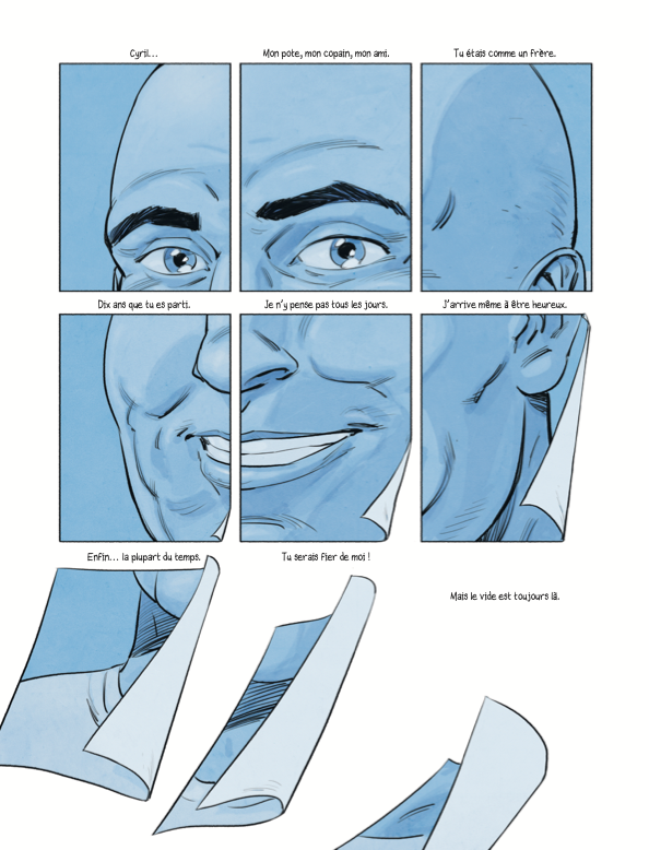 Résumé : Laurent achève ses études aux Arts appliqués de La Souterraine dans les années 1990. Avec deux camarades de promotion, il fonde une agence de communication près de Châteauroux. C’est la débrouille, et l’appartement partagé fait également office de lieu de travail. Un voisin amical les accueille : c’est Cyril, un jeune homme solaire et bienveillant, tout en force musculaire, amateur de musique et de motos. Cyril est tout l’opposé de Laurent, plutôt gringalet et introverti. Pourtant, Cyril et Laurent nouent rapidement une amitié féconde, qui se construit autour de la musique et de valeurs partagées. Cyril donne confiance à Laurent et l’aide à s’affirmer dans sa pratique artistique et ses relations sociales. Mais alors que Laurent est parti faire carrière à Paris, Cyril tombe malade…