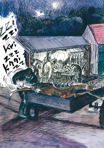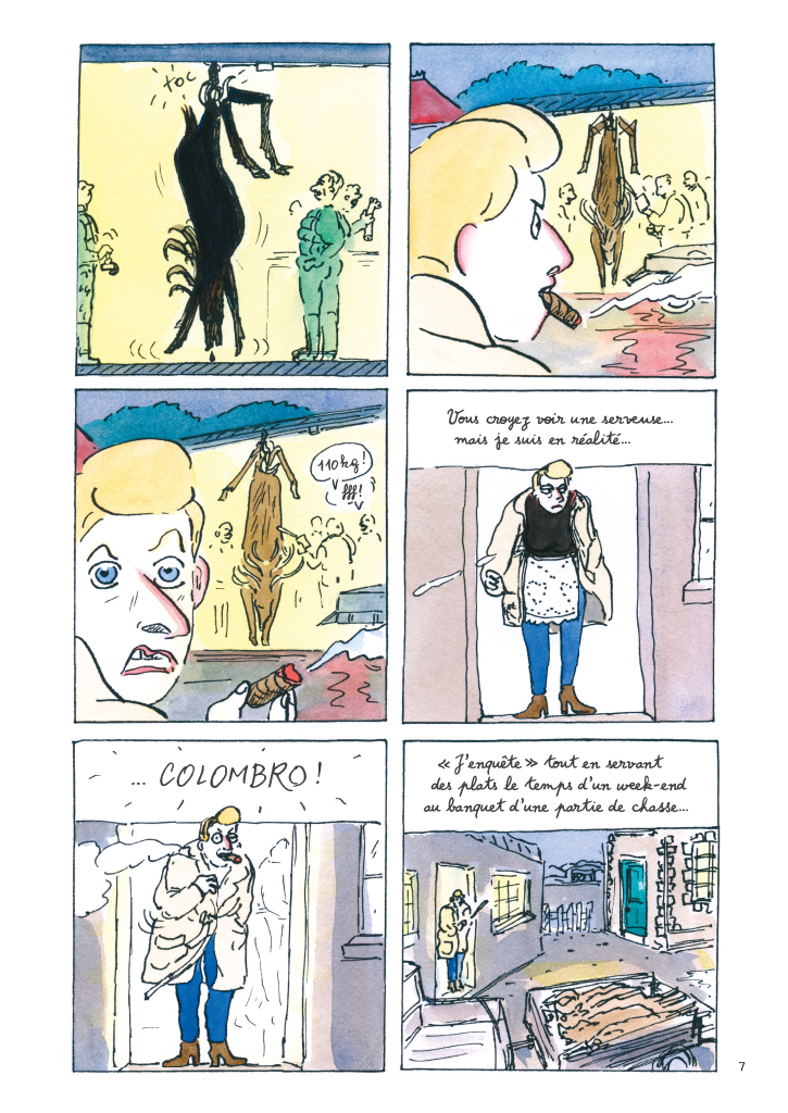 En commençant son album d’une manière crue, sur la découpe d’un cerf à l’arrière d’un pick-up, on se dit que la brutalité va être au cœur de cette enquête. Pourtant, en enchaînant avec une blague incongrue et ringarde sur la ressemblance avec Colombo, elle choisit de donner immédiatement un ton comique, d’autodérision, à son entreprise somme toute personnelle, à la manière d’un Montaigne jonglant entre réflexions philosophiques profondes et remarques sur son compte très amusantes. Ce beau livre est précis dans ses recherches, en témoignent cette infiltration dans un milieu de la chasse, cette fouille dans les archives départementales au sujet d’une rafle, les chiffres affolants de l’Office National des Forêts. L’album se veut également désordonné, comme le montre la pagaille monstre dans ses enchaînements et dans son organisation, un peu comme si Buffon, voulant se sentir comme Lamartine, avait hérité du style d’un Perec ou d’un Vian. L’ensemble tangue souvent mais se remet toujours sur le droit chemin, à savoir celui qui mène à la forêt, explorant tour à tour et sans transition l’histoire des gitans, le dépérissement des sols et la poésie d’une aube sur les arbres.
