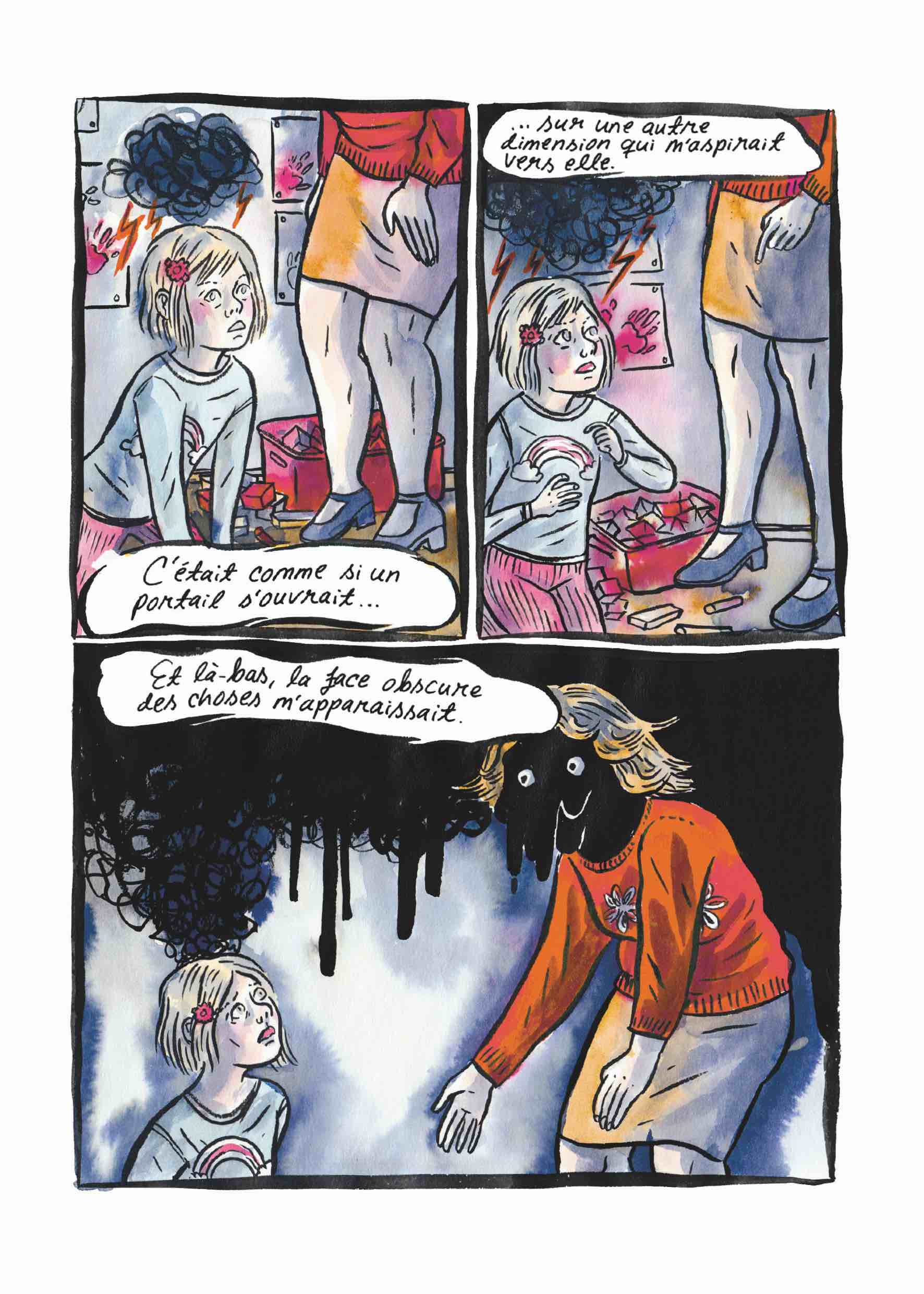 Comment sort-t-on d’un état de dépression chronique ? Comment représenter l’état de vide absolu que rencontrent les personnes frappées d’angoisses existentielles ? Si l’autrice ne le mentionne pas dans les 300 pages de son récit, l’ouvrage lui-même constitue sans doute une étape dans le rétablissement d’Emmi Valve, qui par son geste créatif prend de la distance avec la maladie. De cette manière, elle se met à nu et livre un témoignage tout à fait saisissant sur la dépression, de ses symptômes à ses conséquences sur la vie quotidienne. Elle narre notamment sans fausse pudeur – et sans pathos – son rapport à la sexualité et les agressions dont elle a été victime.