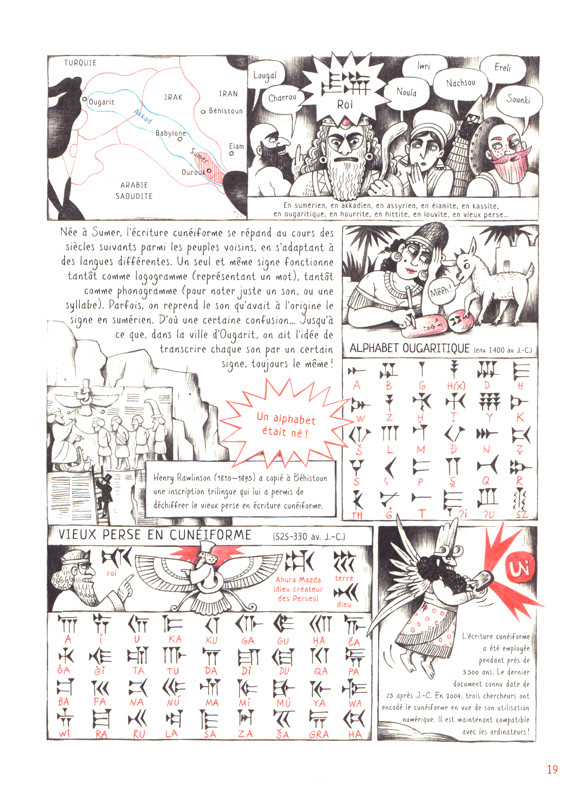 Cette bande dessinée de grande taille n’est pas très épaisse avec ces soixante-dix pages, mais ne vous y trompez pas : elle est dense. Ces grandes doubles planches offrent un large panel d’informations. Les personnages historiques s’enchaînent, car que serait l’écriture sans ces gens qui un jour décident de poser des lettres, des pictogrammes sur les sons qu’émettent leurs compatriotes ?