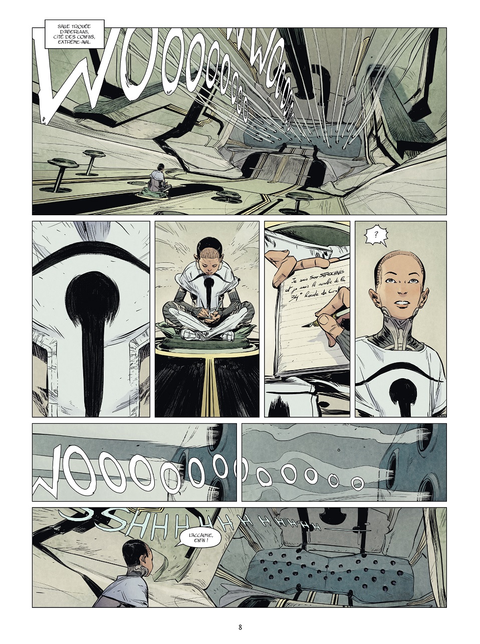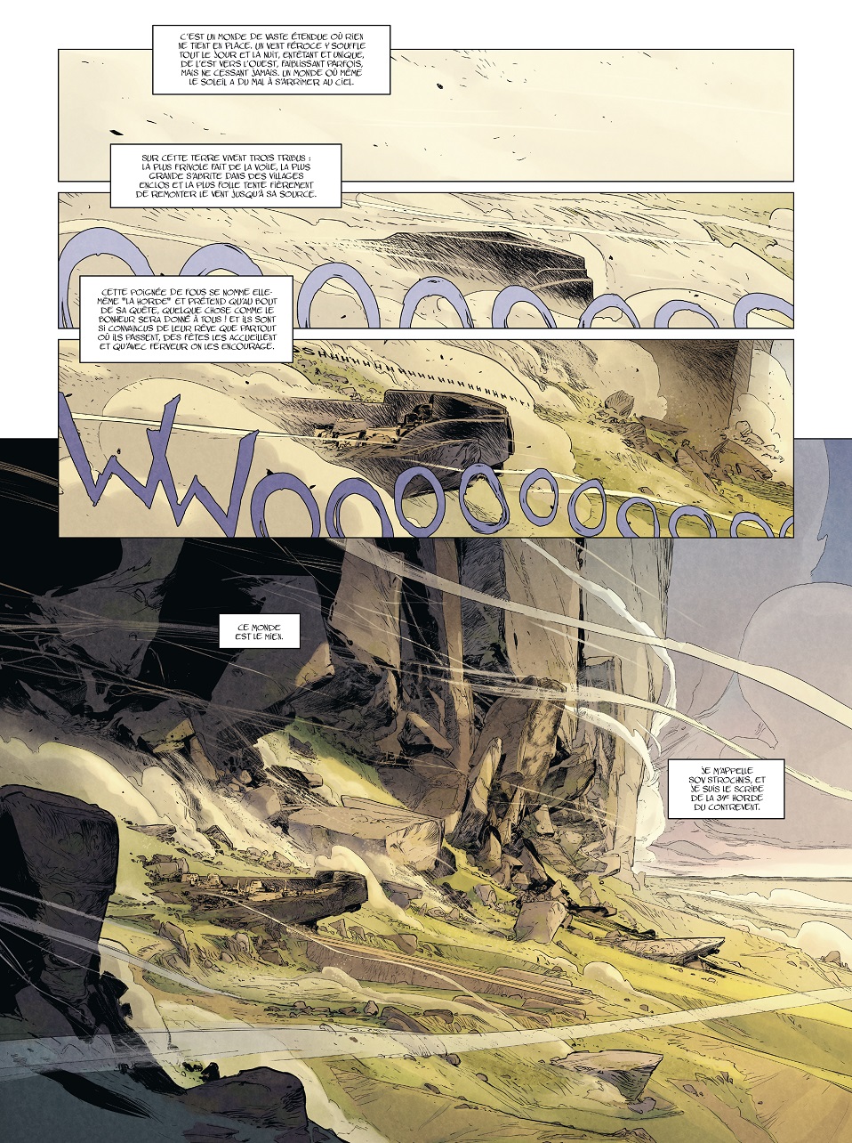 Les personnages étaient attendus, ils sont passés en revue, et le constat est le suivant : tous charismatiques à souhait, ils remplacent aisément ceux que l’on avait pu imaginer auparavant. Viennent ensuite les éléments, le décor et surtout la place du vent : ce dernier crépite sur les pages, semble quasiment les faire voler, et les tons ternes, monotones forment un espace désertique, poussiéreux et craquelé qui colle parfaitement à l’ambiance. Là encore, le constat est sans appel : une réussite totale, une immersion complète dans la trace de cette trente-quatrième Horde, qui devrait découvrir dans les tomes suivants (cinq ou six sont en prévision) des lieux plus pittoresques, voire colorés.