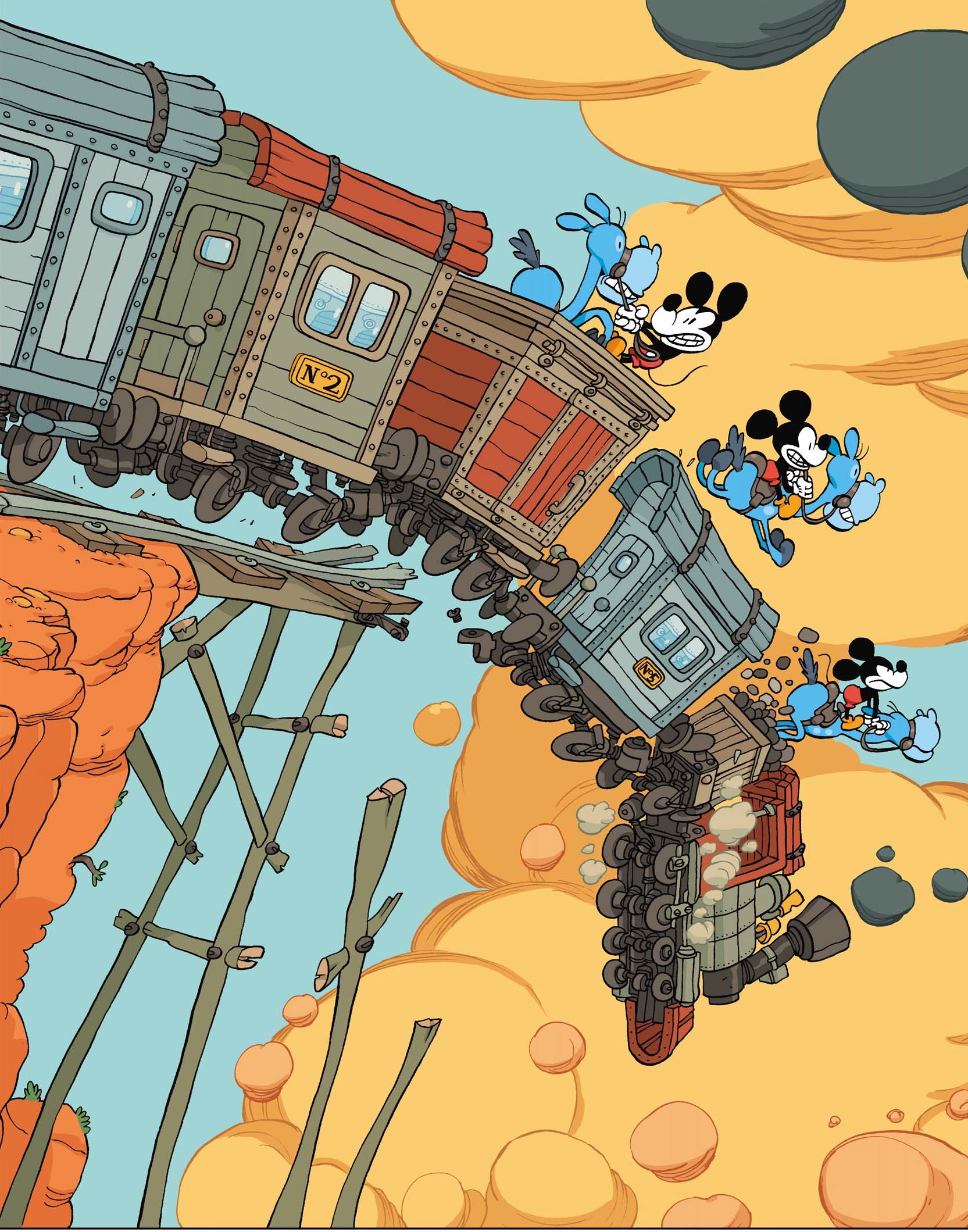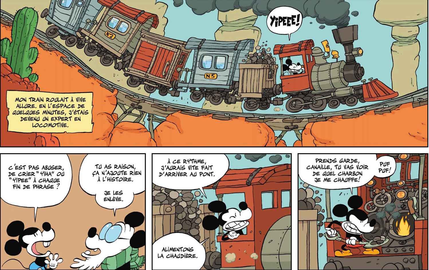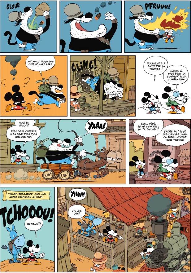 En effet et c’est là la grande réussite de cet album, Tébo a réussi a garder le socle stylistique "Disney" fait de mouvements, de traits arrondis, tout en créant son propre Mickey avec une bouille très moderne. On ne vous parle même pas de certaines doubles pages, sans parole, ou Tébo nous livre tout son talent.
