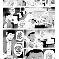 Globalement, le dessin est bon, intriguant, voire déroutant sur certaines planches. Pas tant les personnages, même si la fille borgne et les musiciens masqués ont un côté dérangeant, mais davantage les forêts, avec leur capacité à changer, à surtout empirer au fil des pages. Le noir et le blanc, très réaliste, profond et roman graphique dans le prologue, laisse place à des ténèbres et un certain vide, et on se prend à regretter quelques couleurs ou nuances, de manière à éviter à l’album cet aspect très mélancolique, voire tragique sur les bords. Il y a même un côté Dumbo de Disney, dans cette scène étrange où les éléphants roses dansent à cause de l’alcool, avec la particularité physique du héros, comme un exorcisme d’un traumatisme d’enfant à travers le rêve et le dessin.