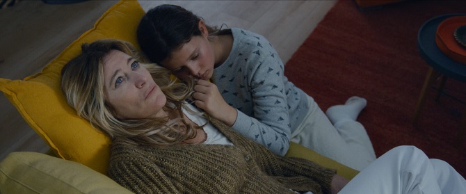 Dans une ambiance un peu décalée, un étrange ballet va s’organiser autour de la mesure préventive infligée à Margaret : sa mère fantasque, toujours au bord de l’explosion, se sépare de son piano et se console très vite dans les bras d’Hervé (Dali Benssalah), un homme de l’âge de sa fille aînée. Il y aussi Louise la cadette (India Hair), qui a une vie plus rangée et est sur le point de donner naissance à des jumelles. La petite Marion, elle, va tracer à la peinture, une ligne bleue pour s’assurer que Margaret ne transgressera pas son interdiction.