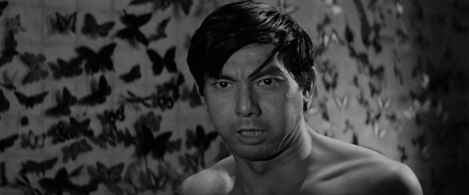 Mais c’est d’abord l’imagination sans fin de Suzuki qui retient l’attention : ainsi de Misako, la femme dont le tueur tombe amoureux ; placée sous le signe de l’eau, elle lui apparaît sous la pluie, qui se transforme en douche érotique. La fois suivante, elle sera vue à travers une fontaine bruyante – car, il faut ajouter aux recherches formelles un travail sur la bande-son d’une grande complexité. Second motif, son goût des papillons épinglés, forcément excessif : elle est couchée sur un lit de papillons, et les murs de son appartement en sont couverts. Le jeu de la comédienne qui l’incarne relève du minimalisme, tant et si bien qu’elle n’est qu’un masque fantasmatique, une ombre (« je suis déjà morte », dit-elle). À son opposé, Hanada, le tueur numéro 3 de l’ « organisation » parcourt le film en martyr ; il ne cesse de s’effondrer, de grimacer et de se faire tirer dessus. L’imagination de Suzuki se concentre sur les meurtres et les scènes d’action qui le concernent : de la fuite sur un ballon publicitaire à des plans subjectifs, c’est tout un arsenal d’artifices que le cinéaste déploie, comme des variations sur un motif épuisant les moyens du cinéma.