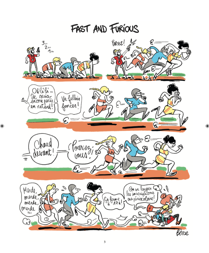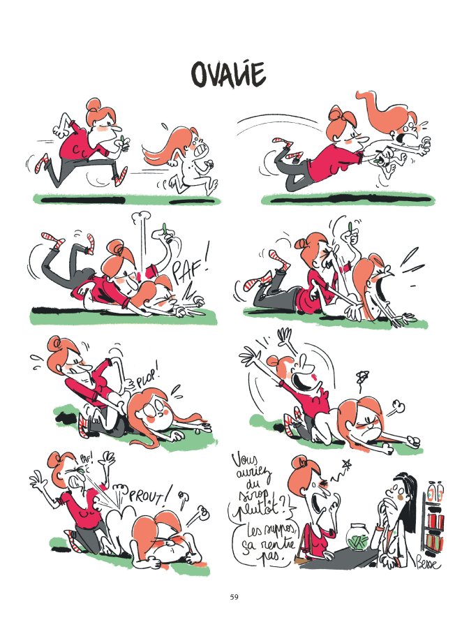 Critique : Camille Besse a le sens du rythme nécessaire à la bande dessinée d’humour et plus particulièrement à celle qui se développe en une seule page. Si les situations sont le plus souvent bien campées et drôles, les chutes sont régulièrement surprenantes, constituant un point d’orgue. Ainsi, à plusieurs reprises, l’autrice joue sur un décalage entre ce qui est suggéré et le résultat, notamment en employant un vocabulaire qui induit une connotation sexuelle et une chute qui amène le gag ailleurs.