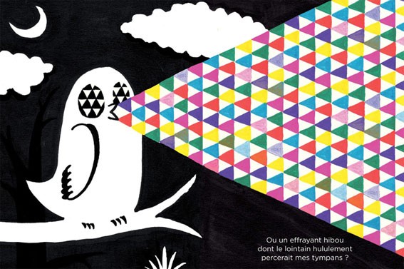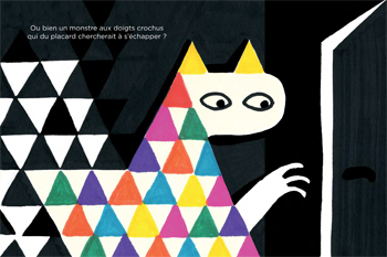 La nuit dans mon lit a la spécificité de se présenter sur fond noir avec comme fil conducteur un graphisme de triangles colorés et l’ouvrage déroule - à travers le récit d’un petit garçon - toutes les peurs qui jaillissent dans son esprit au moment du coucher.