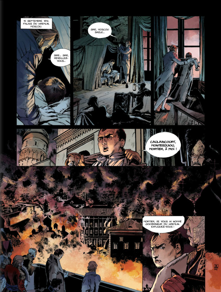 Ce choix peu courant peut surprendre le lecteur. Mais ce tracé trouve sa force dans l’utilisation des ombres, les décors perdus dans la fumée de l’incendie de Moscou, les arbres se dressant au clair de lune, les personnages de l’arrière-plan se fondant comme des tâches noires dans ces lieux esquissés. Et surtout, c’est dans les scènes d’action que le trait de Delaporte dévoile sa force. Les chevaux au galop, qui cabrent sous la mitraille, les corps qui se heurtent, sabre au clair, les hommes qui s’abritent ou se font surprendre par les explosions et les balles sifflantes. Le tout est renforcé par ce rouge du feu et du sang qui s’oppose et contraste avec le noir de la nuit.