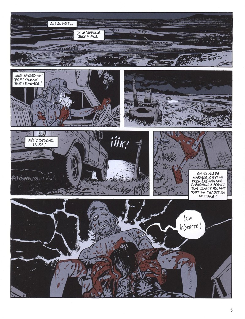 Résumé : L’histoire commence avec Josep, éleveur d’autruche, qui fend la tête de sa femme à coup de pelle, et balance son corps dans un puits. Un travail difficile, qui se termine avec un retour à la maison avec le sentiment du devoir accompli... mais pour y retrouver son épouse l’attendant, souriante. Un thriller court et cauchemardesque s’engage.