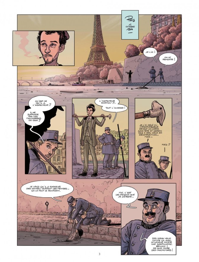Nouvelle histoire, même époque. Nous suivons donc de nouveaux personnages et nous croisons, le temps de quelques échanges ou d’une case, les héros et autres intervenants de la première histoire. Ces deux récits ne sont donc liés que par la Tour Eiffel et ce Paris de la Belle époque, comme l’avaient annoncé les auteurs. L’enquête nous donne l’occasion de découvrir certains des petits métiers de la capitale.