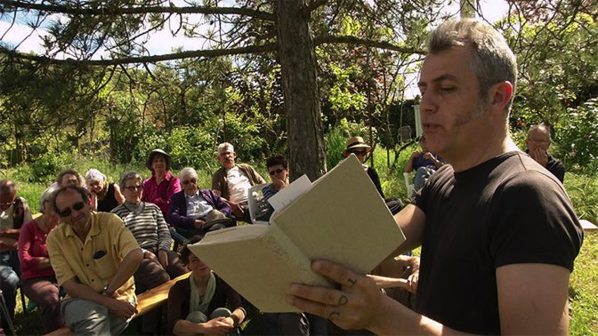 Professeur pendant vingt ans, Guyard a abandonné son métier pour parcourir la France et s’adresser à des publics très différents : des prisonniers d’un centre de détention en Belgique, des touristes flânant dans la Grotte des Demoiselles, un collectif de paysans dans une commune agreste ou un institut de formation de puériculture. « La philo vagabonde » étire sur un peu plus d’une heure trente un premier documentaire consacré à ce truculent personnage et intitulé « La philo à bras le corps ». Il permet à Guyard d’expliciter sa démarche : « Mon objectif n’est pas de clarifier les choses, mais de foutre la merde ». Pour ce franc-tireur sensible aux idées libertaires, la philosophie nous confronte à des questions beaucoup plus qu’elle n’apporte de réponses. A travers ses interventions, qui empruntent à la fois au stand-up et au cours de lycée, cet iconoclaste réactive la pensée de Nietzsche et sa critique de la morale universelle, parle de Platon dans une caverne, convoque Lucrèce en plein nature, cite Jankélévitch devant une Association pour le développement des soins palliatifs, en insistant sur notre existence précaire et pourtant si précieuse, où le malade condamné n’est pas un moribond : « Ce sont les derniers instants d’un mourant ? Faux. Ce sont les derniers instants uniques d’un vivant » assène-t-il à l’auditoire attentif.