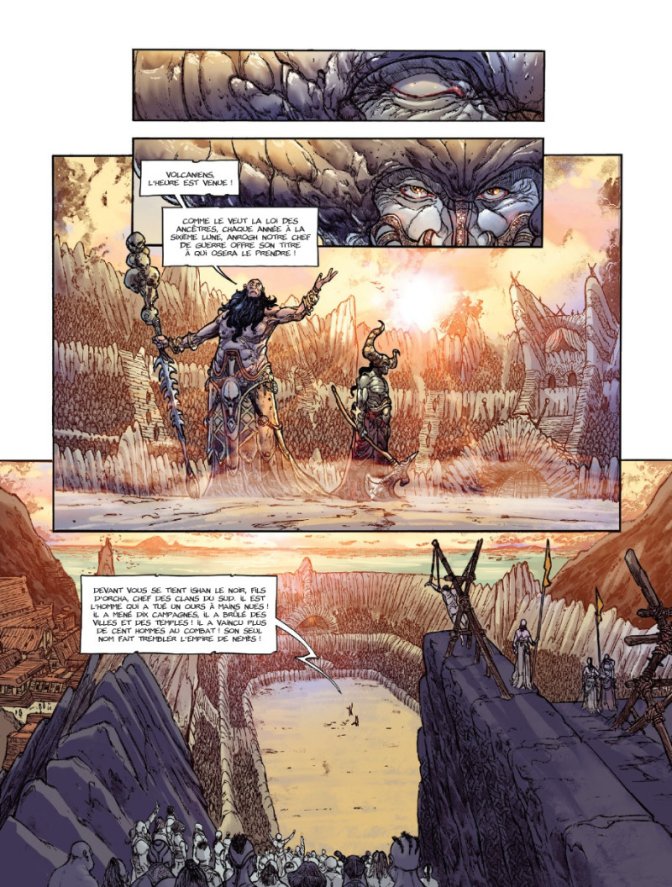 Les compositions de page et la mise en scènes sont aérées. Les cases se succèdent, se chevauchent, se mêlent habilement pour nous garder dans le récit, en nous laissant entrevoir ce monde étrange et cet empire qui n’est pas sans rappeler l’Empire Romain. Certains personnages, sous leur casques, sont parfois difficiles à reconnaître.