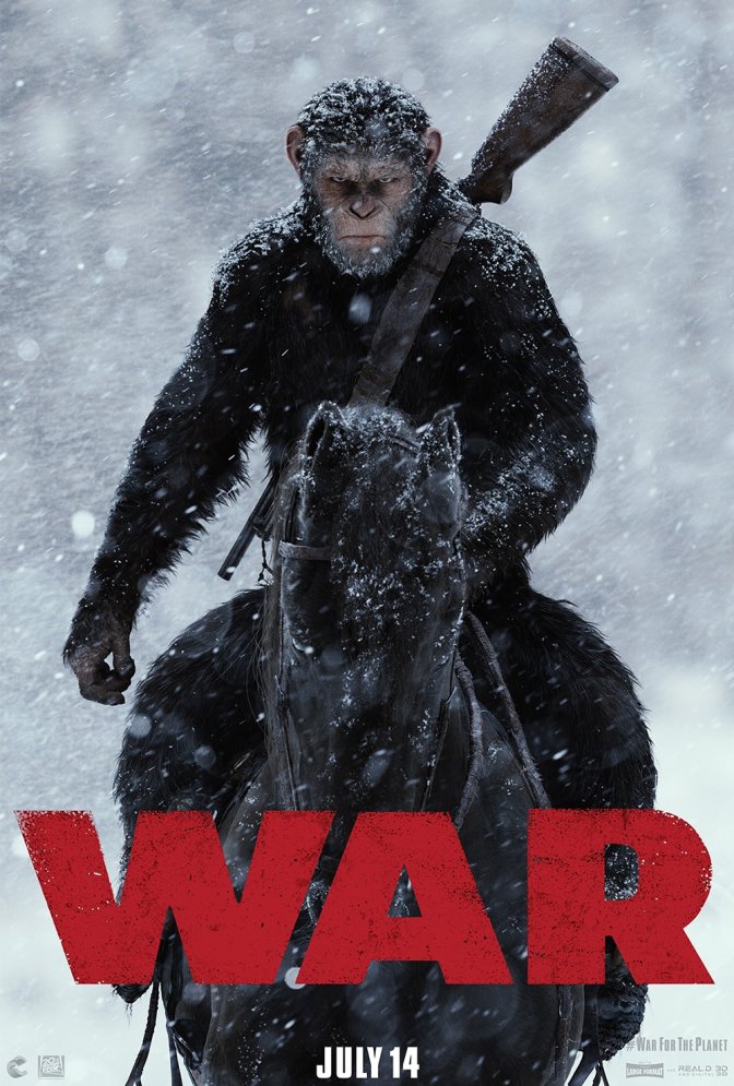 Résumé : César et les Singes sont contraints de mener un combat dont ils ne veulent pas contre une armée d’Humains dirigée par un Colonel impitoyable. Les Singes connaissent des pertes considérables et César, dans sa quête de vengeance, va devoir lutter contre ses instincts les plus noirs. Au terme d’un périple qui le conduira à un face à face avec le Colonel, les Singes et les Humains vont se livrer une guerre sans merci à l’issue de laquelle une seule des deux espèces survivra - et dominera la planète.