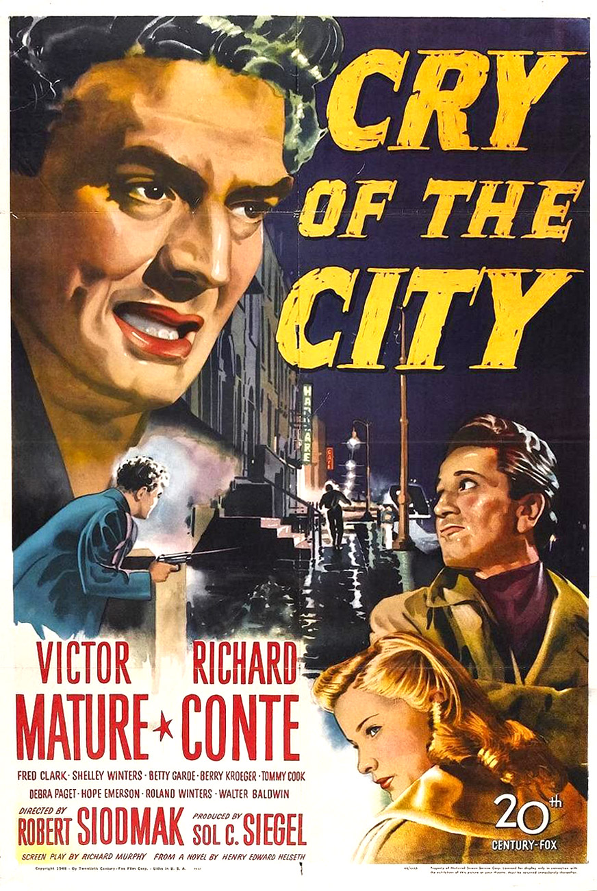 Notre avis : Tourné après Les tueurs et Criss cross, La proie, assez lointaine évocation du titre original Cry of City, se situe dans cette série de films noirs impeccablement réalisés par Robert Siodmak pendant sa période américaine. Moins réussi sans doute, il demeure néanmoins un solide polar urbain, tourné en grande partie en extérieurs, dans le quartier « Little Italy ». Le scénario, écrit par Ben Hecht et Richard Murphy, oppose un policier raide et un gangster séduisant : on retrouve la fascination pour le mal et l’interrogation morale propres au genre, avec un déséquilibre évident tant la part belle est faite au personnage interprété pat l’excellent Richard Conte. C’est son itinéraire qu’on suit, avec un début saisissant dans lequel il est presque mort, jusqu’à la fin où il l’est réellement : on reconnaît un effet tragique, le film n’étant jamais que la réalisation d’une promesse posée dans les premières minutes. Tragique, certes, auquel le scénario ajoute une dimension religieuse inévitable dans un milieu d’origine italienne, sans que ce soit trop lourd. Là encore, c’est dès le début, comme un programme, que cette thématique apparaît, à travers un prêtre au chevet de Martin Rome, mais aussi dans la manière de filmer l’hôpital qui le fait ressembler à une église. Et c’est dans une « vraie » église que se terminera La proie, bouclant une thématique prégnante jusque dans l’impossible rédemption de Martin.