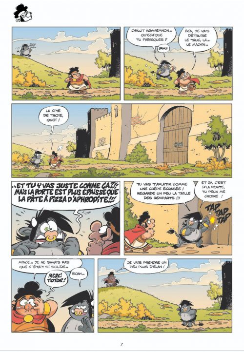 Les gags s’enchaînent et ne se ressemblent pas. Soit effectivement nos héros sont pris comme des jeunes, qui se préparent à la réalisation des hauts faits qui les feront entrer dans la légende, comme Hercule, qui attend le développement de sa force... herculéenne pour remplir ses douze travaux ou Ulysse qui souffre du... mal de mer et préfère rester à terre ! Du coup, les planches de cette optique sont drôles par le gag en soi, et par le second degré créé avec la mythologie.