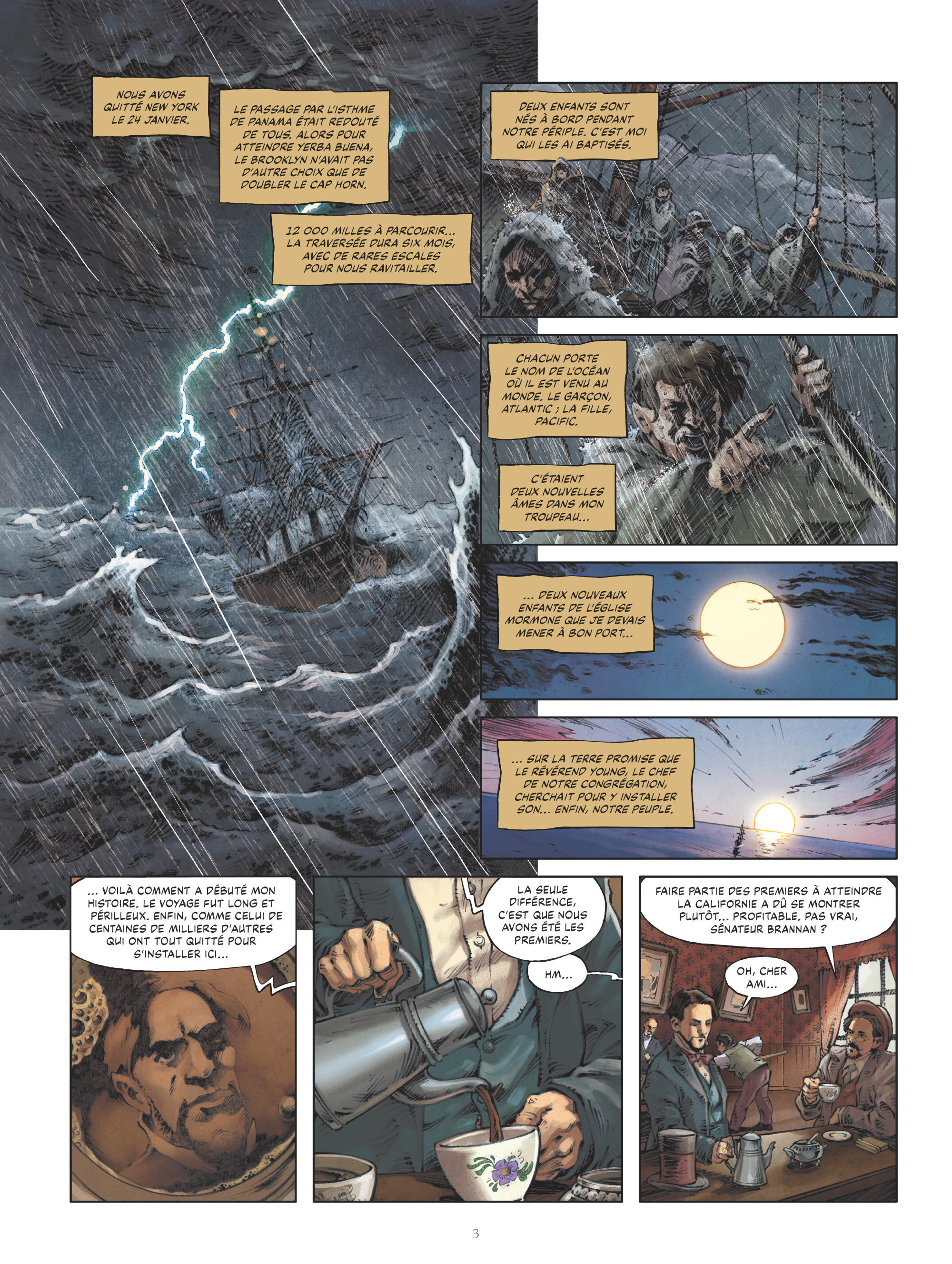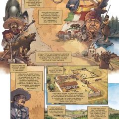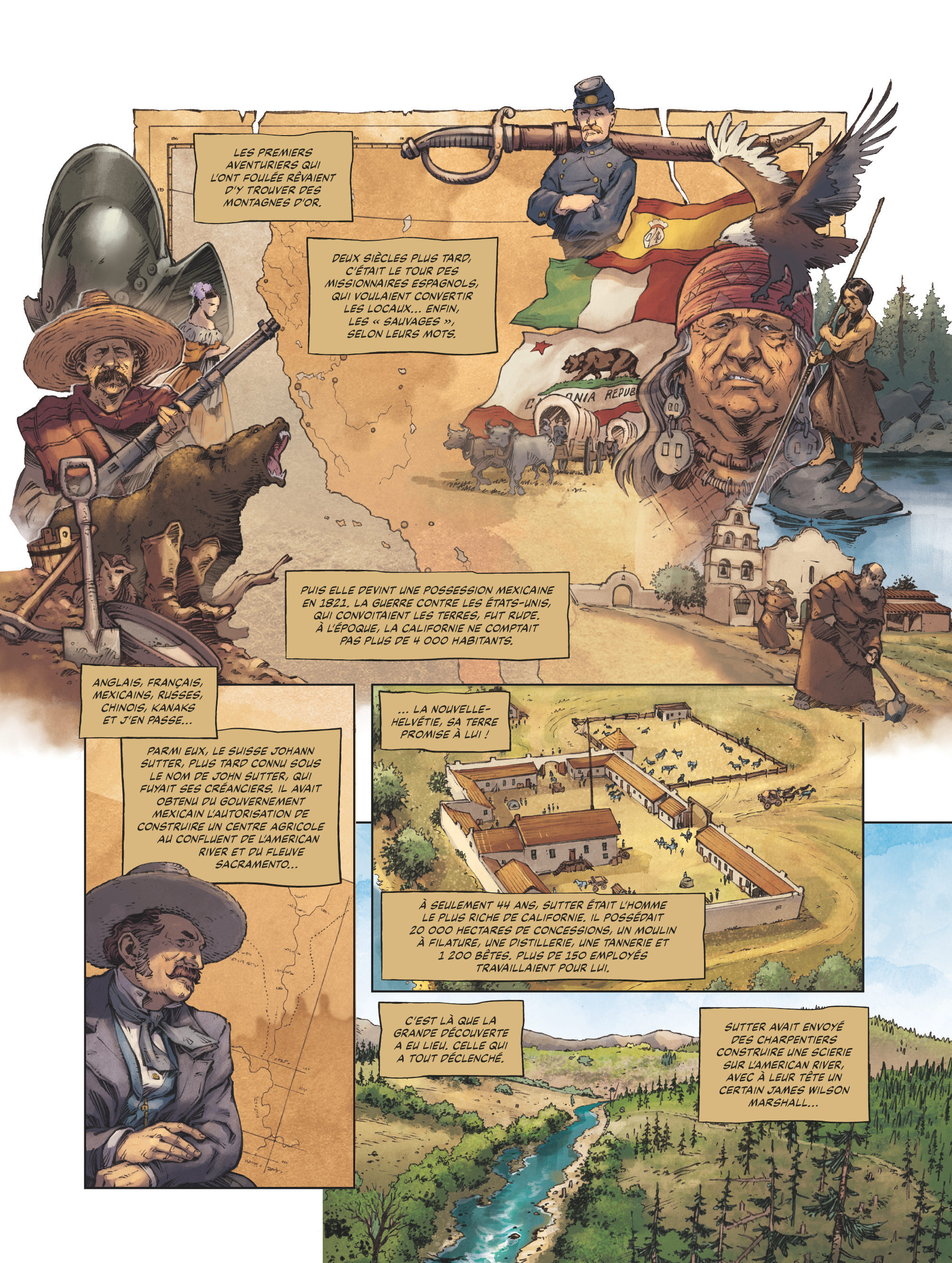 Porté par un dessin réaliste et classique – dans le bon sens du terme –, La ruée vers l’or se concentre met en évidence la figure de Samuel Brannan, qui a le premier propagé la nouvelle de la présence d’or en Californie. Il n’est cependant pas le premier à avoir découvert cette présence : avant lui, le Suisse Johann Sutter, installé dans un ranch prospère dans cette région isolée, avait déjà eu vent de cette découverte, mais avait choisi de ne pas l’ébruiter, justement pour éviter un afflux de population… Nous sommes au lendemain des affrontements entre les États-Unis et le Mexique et de la fondation, par des immigrés mexicains, d’une République de Californie.