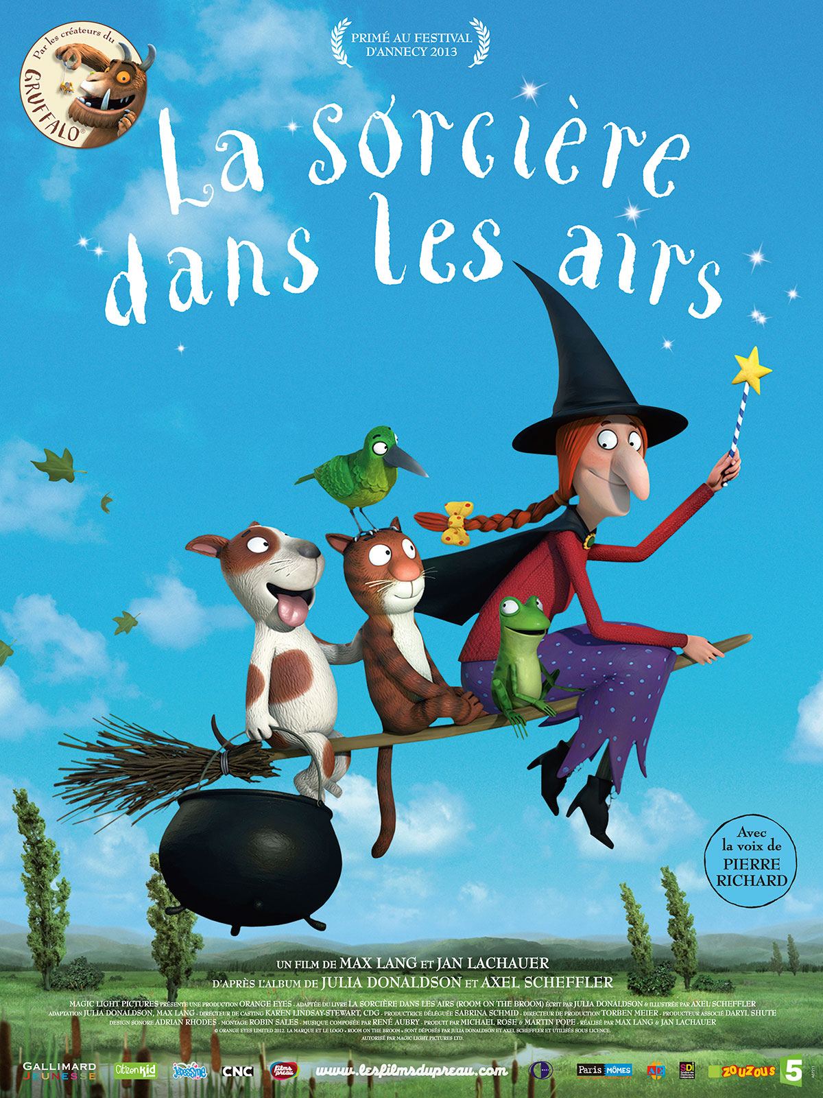 Néanmoins, quelques lacunes viendront ternir la séance des accompagnateurs. La voix-off de Pierre Richard, tout d’abord, qui ne paraît étrangement pas dans son élément dans une lecture itérative. Pourquoi doubler des images se suffisant à elles-mêmes par l’omniscience encombrante d’un narrateur pas franchement utile ? Us et coutumes des dessins animés pour très jeunes ? Piège de l’adaptation trop fidèle à la substance originelle (La Sorcière dans les Airs est à la base un livre pour enfants de Julia Donaldson et d’Axel Scheffler) ? L’académisme de la mise en scène ensuite, est quant à lui un frein palpable au "laisser aller", le découpage étant relativement basique : beaucoup de plans larges en guise de master se resserrent progressivement sur des gros plans illustratifs. Puis subsiste un ultime point noir au tableau : le récit. Ce dernier n’est qu’un faire valoir à la mise en place des thèmes traditionnels de la littérature enfantine et reste scrupuleusement attaché aux mouvements du balai magique (envol, chute, envol, chute etc.) légèrement répétitifs.