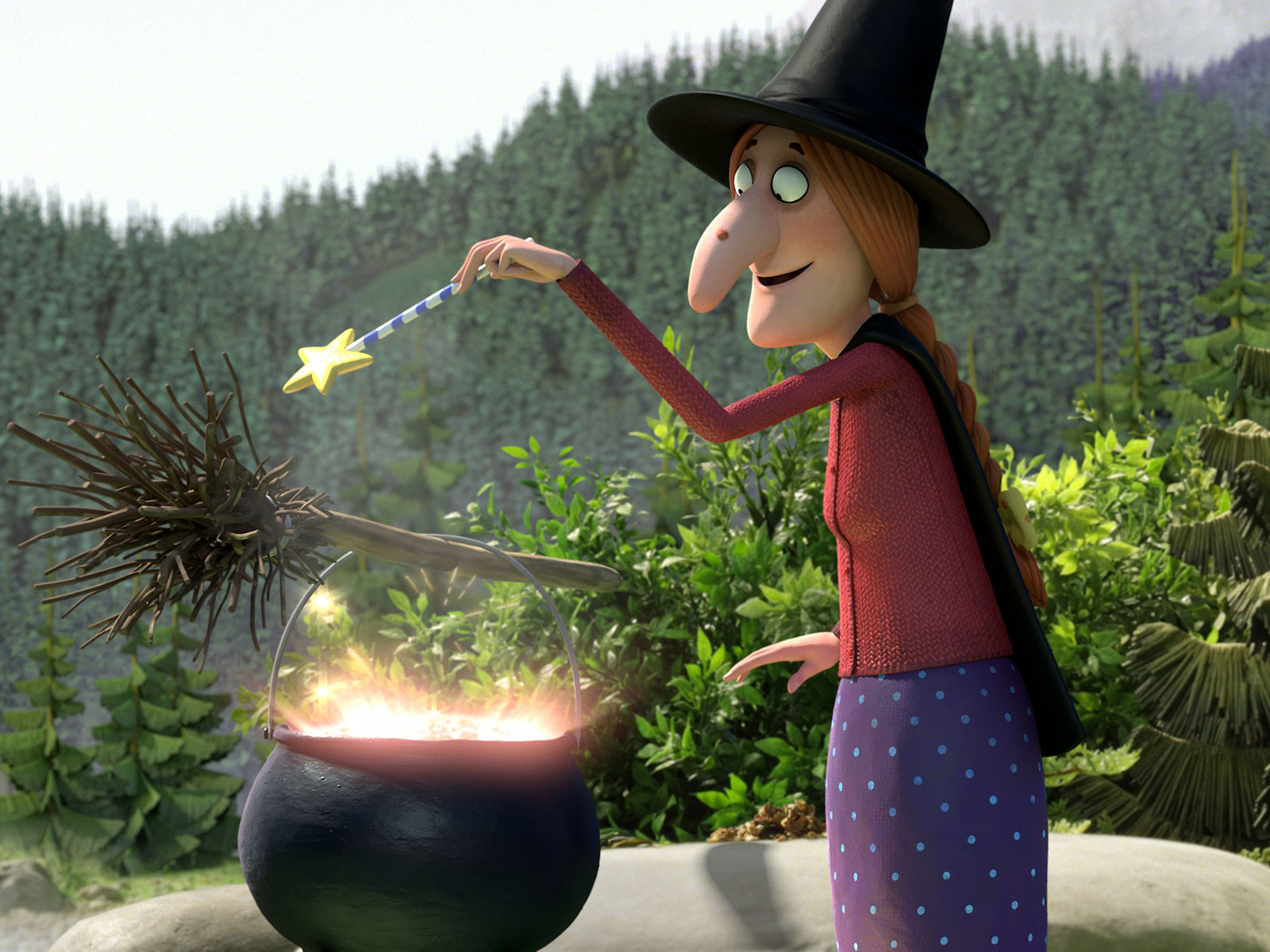 L’argument : Une gentille sorcière, accompagnée de son chat suspicieux et de son chaudron, s’envolent sur un balai. Il se dégage un plaisir espiègle de ces instants de liberté en apesanteur… jusqu’à ce que des invités inattendus fassent leur apparition et qu’un dragon affamé décide de poursuivre le petit groupe.