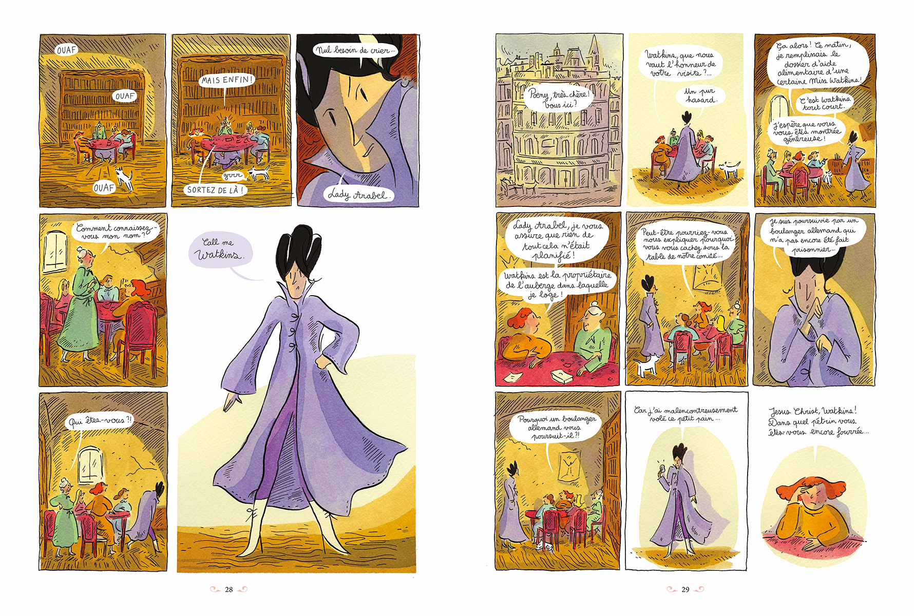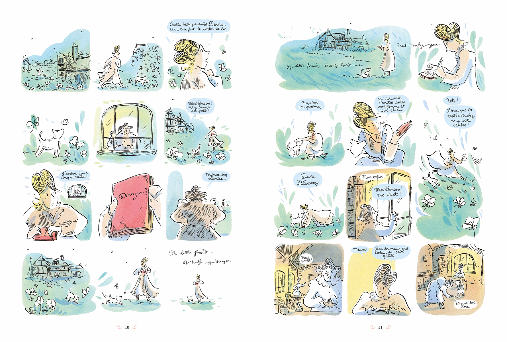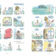 Cette double narration fait le sel de cet album aux jolies aquarelles. La couleur assure la cohérence de l’ensemble, chaque séquence dans la vie quotidienne de Stella Benson ou dans celle qu’elle imagine pour Sarah Brown étant déterminée par une colorisation différentes. Nina Six joue notamment sur l’atmosphère enchanteresse crées par les teintes violacées. Les personnages sont dessinés avec peu de traits, mais cela suffit à donner aux personnages leur expressivité, dans une tradition graphique qui emprunte à la caricature. La sorcière de Londres parvient de cette manière à montrer à la fois la difficulté de la vie des civils en période de guerre et la capacité d’évasion de la littérature, en nous faisant partager l’univers de cette écrivaine trop méconnue. L’album met également en évidence le choix fait par l’écrivaine de rester célibataire en dépit de la pression sociale, un choix de vie inhabituel qui lui fait renoncer à un confort de vie bourgeois. Pour Benson, qui préfère la fidélité de son chien à la compagnie des hommes, la liberté est à ce prix.