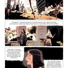 Pour raconter cette jonction entre la mythologie et l’Histoire, Louis Pelosse a répondu à l’appel en proposant un style particulier, que l’on pourrait qualifier au premier abord de simpliste, façonné pour un roman graphique plus qu’un album historique, mais qui dévoile peu à peu des détails insoupçonnés et fascinants. Que ce soit dans des vêtements d’affranchis, dans la nudité d’une femme près du fleuve, dans un combat entre plusieurs adversaires sans entraînement, les éléments s’enchaînent et trouvent leur place dans un grand tout qui fonctionne, comme si on avait restitué la Mésopotamie du XVIIIe siècle avant Jésus Christ avec un style moderne, se reliant ainsi à cette tonalité des dialogues pour donner à voir une œuvre intelligente et originale.