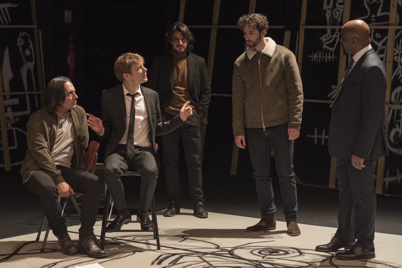 Le décor est sobre sur ce plateau du Théâtre 13, sous la houlette scénographique de Delphine Brouard. Au sol, un grand visage stylisé au tracé blanc, représentant de toute évidence le spectre du roi décédé, se dévoile au milieu de la pièce. Deux grands panneaux noirs imposants symbolisent les murs du château dans lequel se joue cette tragédie intemporelle de l’existence humaine. Quelques chaises.