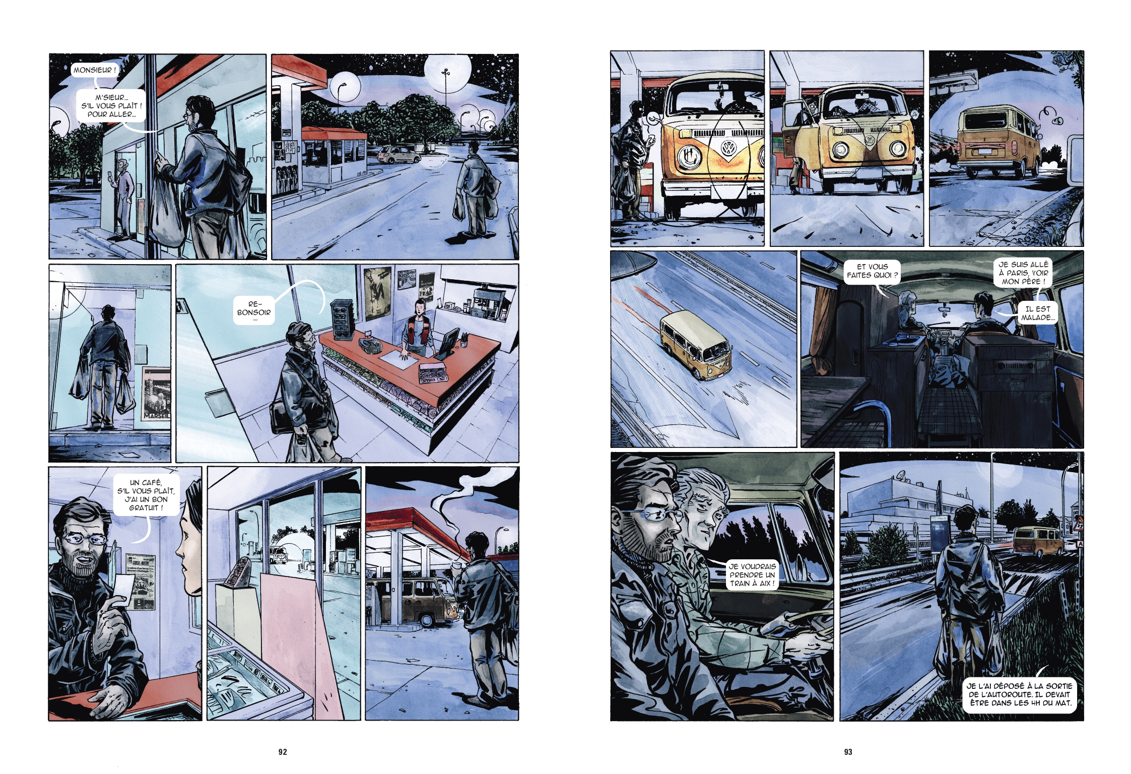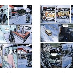 On a l’impression de la mener cette enquête, aux côtés de la cellule de police, des journalistes d’investigation, des limiers du dimanche et des complotistes des réseaux sociaux… On a sous les yeux des cartes, des croquis, des reproductions de photographies et des retranscriptions d’interview. On suit les différentes pistes, dettes, adultère, délire mystique… On enchaine flash-back, portraits des membres de l’entourage, suivi d’enquête, copies d’images d’archives, et gros plan sur les preuves matérielles. Chaque « thème » ou lieu développant une identité visuelle propre, qui aide à se repérer parmi la densité d’informations communiquées, mais le tout s’unifiant dans un camaïeu bleu-gris-noir.