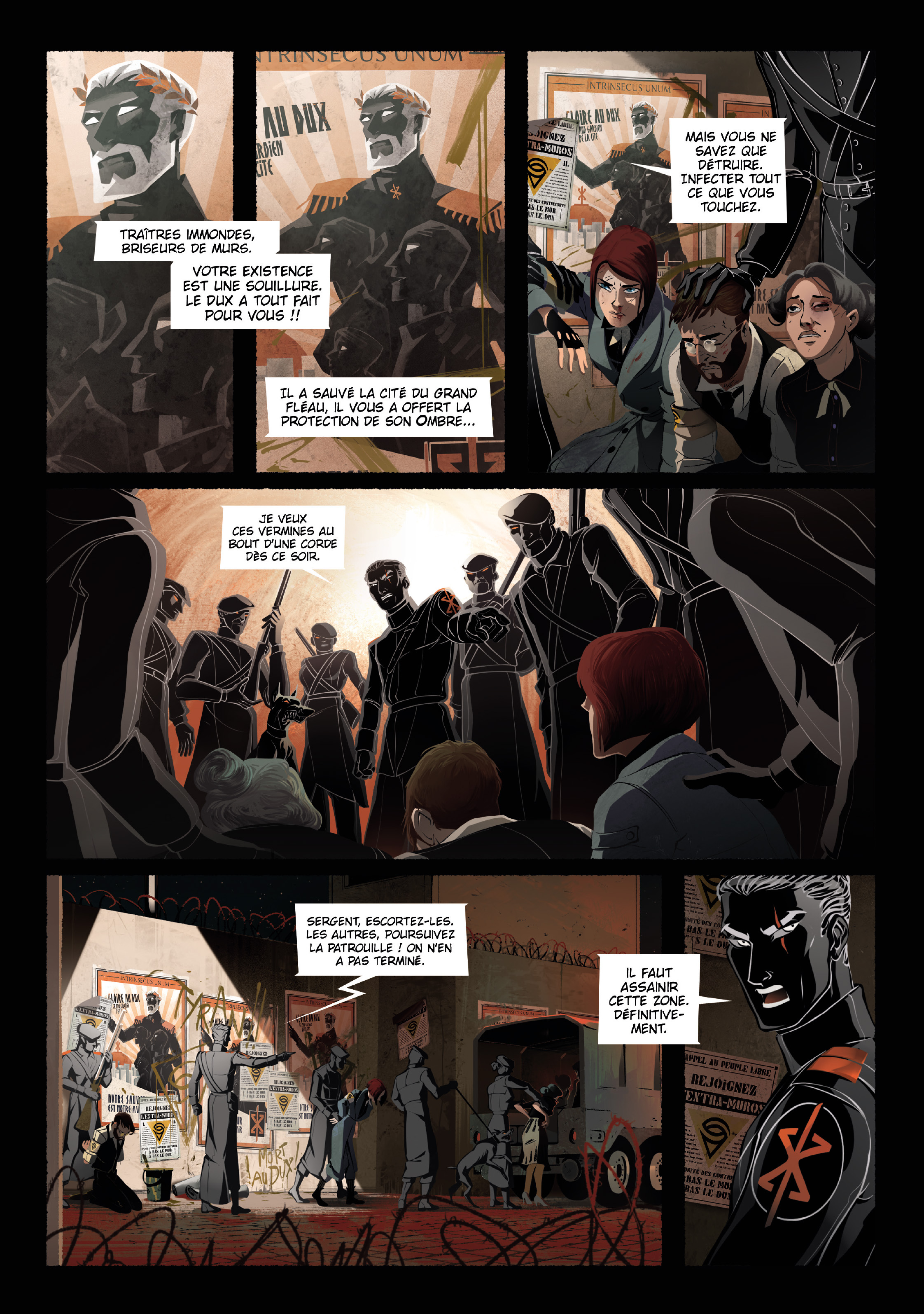 Ce récit d’anticipation lorgne autant du côté de l’anticipation – normal - que du fantastique. Anticipation avec cette cité coupée du reste du monde par un mur et son dirigeant, le Dux, appellation n’étant pas sans rappeler le tristement célèbre Duce Italien Mussolini et ce n’est pas pour rien. Mais le Dux et ses hommes, ses fidèles, se différencient du reste de la population par une apparence étrange. Ils sont noirs au traits blancs, comme des négatifs d’être humains. Cette apparence est liée au fait qu’ils ont basculé du côté des Ombres... Et là, l’anticipation, elle, bascule dans le fantastique.