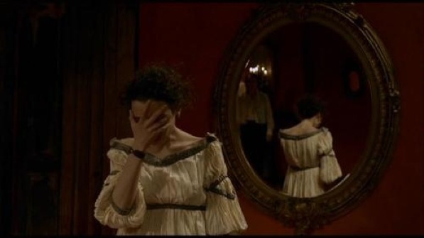 Car il ne pouvait s’agir de simplement illustrer la nouvelle de manière redondante ni d’en dérouler l’intrigue de manière platement chronologique sous la forme d’un quelconque téléfilm en costumes. Il fallait la traduire, en portugais d’abord, en supprimant au passage la foule d’adjectifs qualificatifs* si caractéristiques de la prose française du XIXème siècle et en introduisant des éléments venus d’ailleurs (une citation de Camões par exemple) ; la mettre à distance en faisant intervenir une figure de narrateur et en insérant le récit-cadre dans un cadre supplémentaire (le magazin d’accessoires du studio de cinéma), en ajoutant des témoins (saisissante apparition muette de la grande Isabel Ruth en vieille dame assise dans une taverne puis se levant et s’approchant des personnages qui discuttent à une table sans même remarquer sa présence) ; en faisant explorer par la camera d’extraordinaires plans-tableaux parcourus, sur fond de toile peinte, de déplacements savamment orchestrés (hommes et animaux traversant l’écran en tous sens, sortant par exemple par l’avant !) ; en obtenant du virtuose Acácio de Almeida des couleurs étonnantes (la robe jaune) et de Joachim Pinto un contrepoint sonore recourant de manière inattendue, et totalement convaincante, aux oeuvres des compositeurs de l’Ecole de Vienne (Schoenberg transcrivant, c’est à dire traduisant Bach ; Berg ; Webern ; mais aussi Grieg ou un air du dix-septième siècle, non moins anachronique, d’Etienne Moulinié).