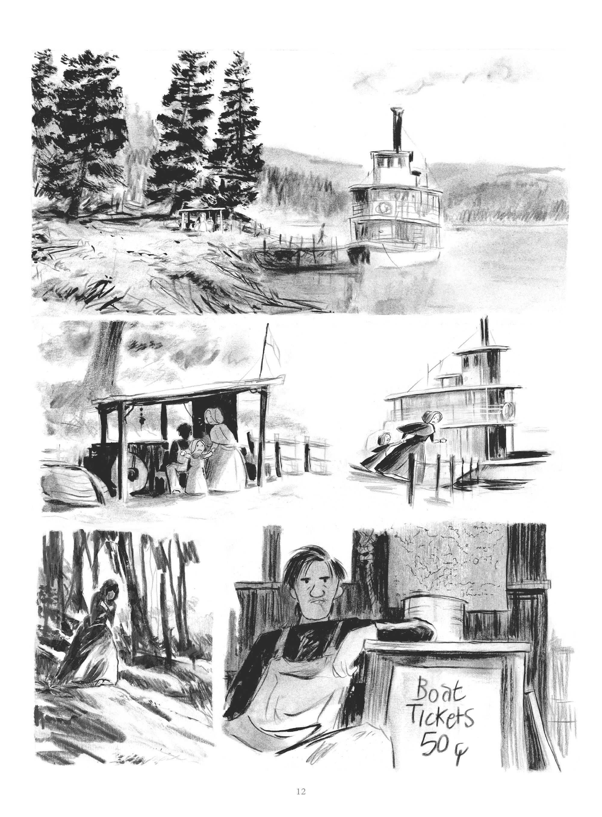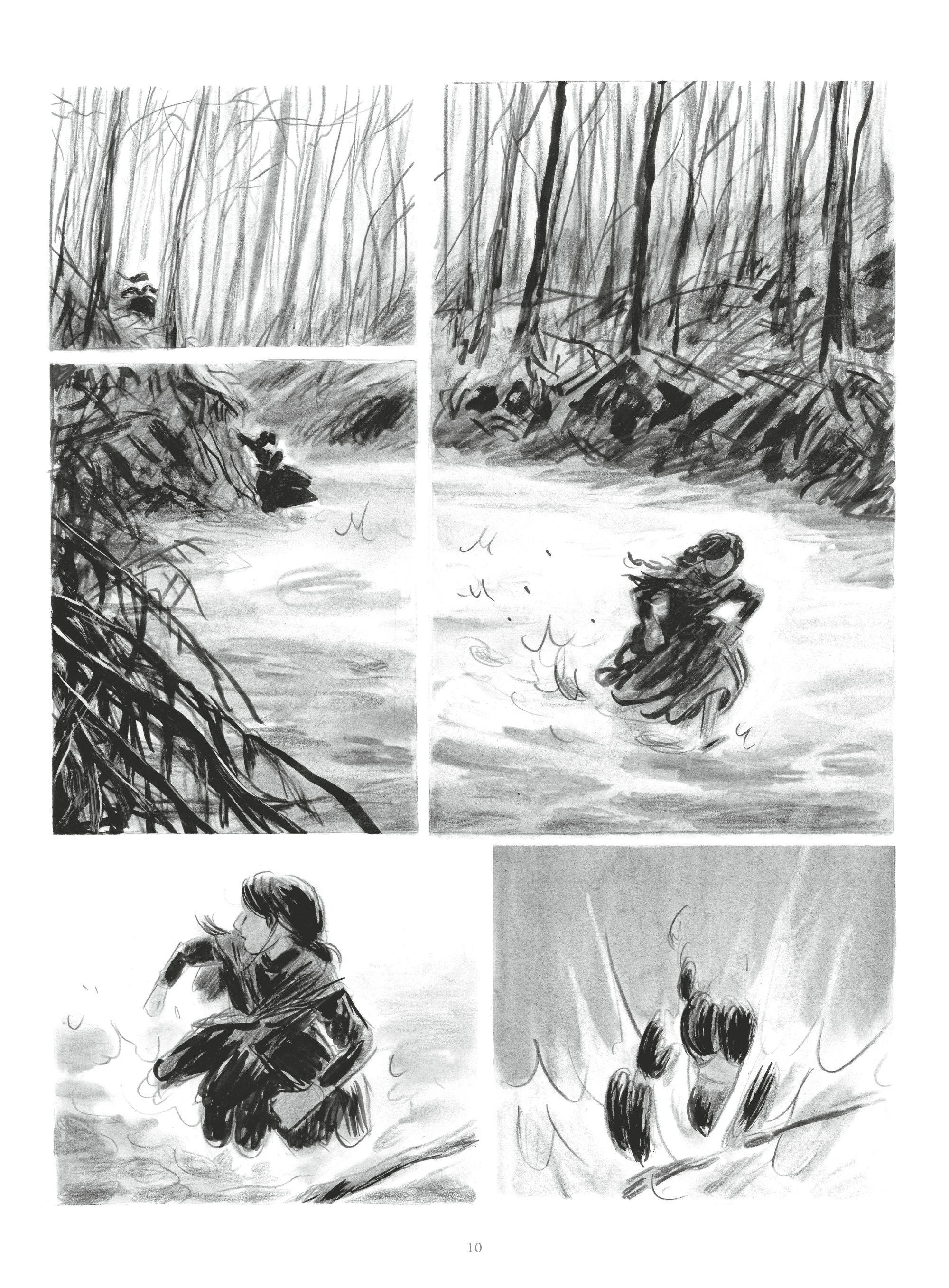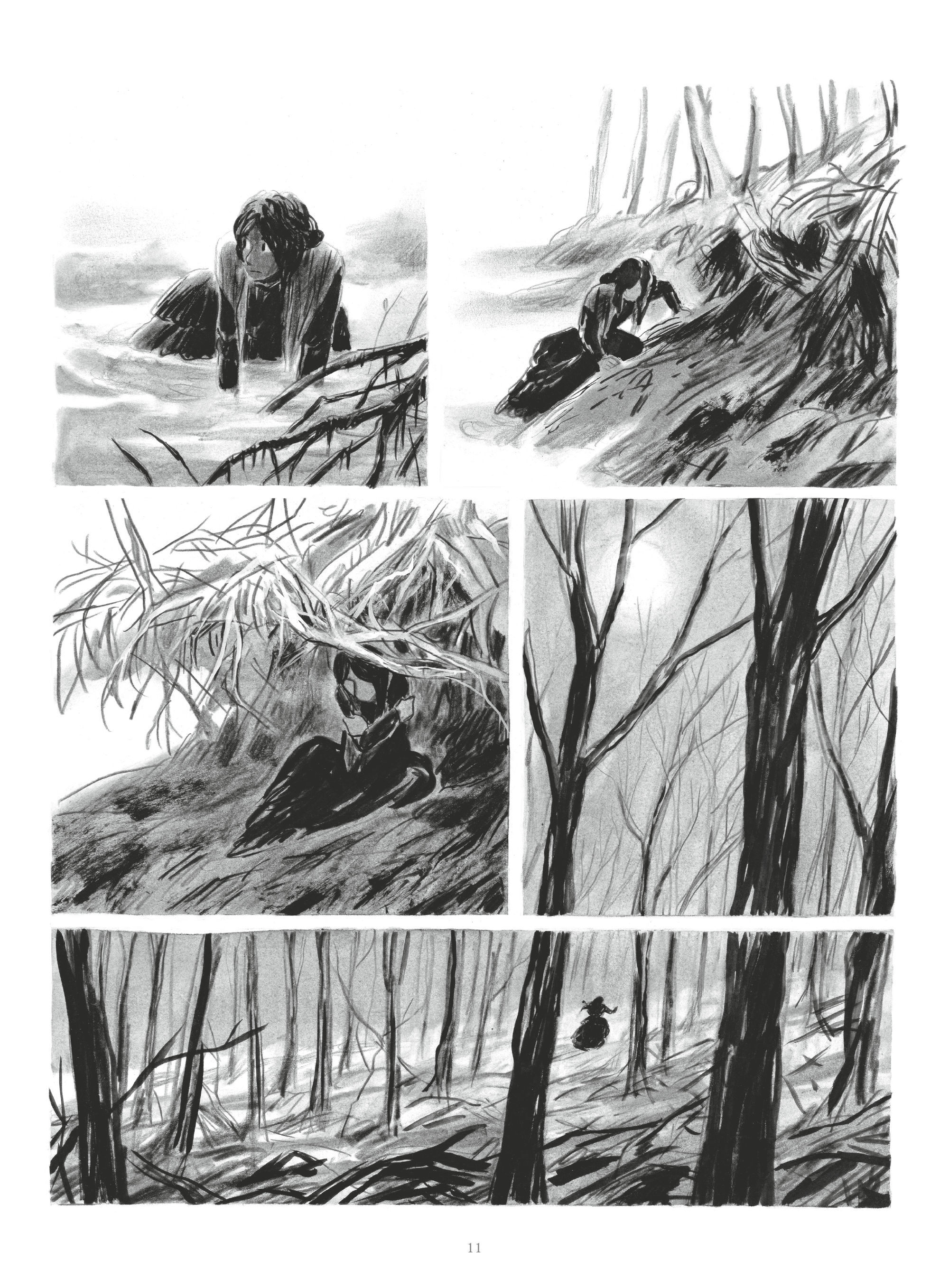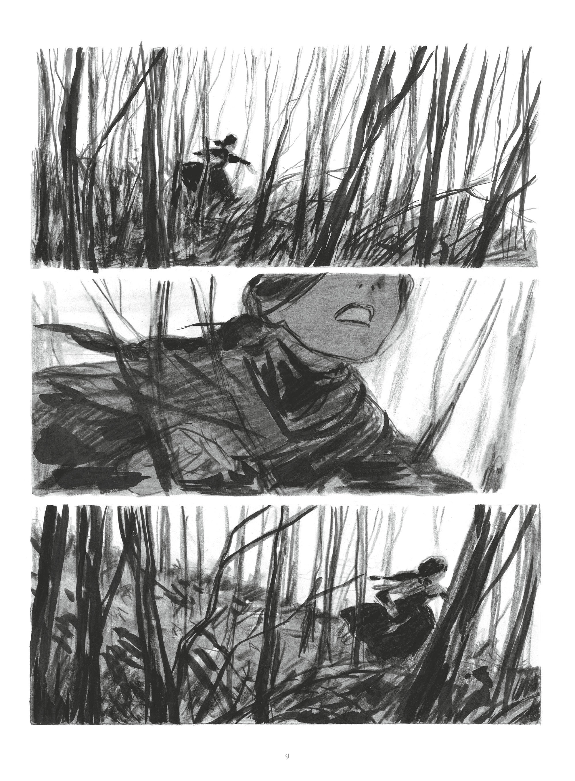 Critique : Glen Chapron adapte ici un roman de Gil Adamson. Dès le début, nous sommes happés par les partis pris du récit qui se mettent au diapason de l’héroïne et de son rythme. Découpage et mise en page privilégient ainsi le dynamisme, orchestrant la fuite de Mary. Le dessin à l’encre, vif et ample, s’attache au corps dans le décor, aux dangers qu’il doit affronter, aux répits qu’il trouve. Il retranscrit pleinement les mouvements, luttes, pauses et épuisements de la jeune femme.