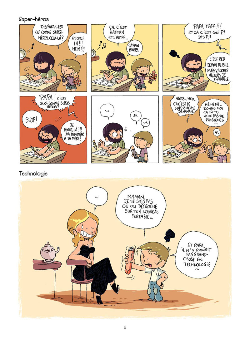 Une BD classique de 48 pages qui se décline en gags d’une demi-planche. Le point de vue varie mais reste celui de l’un des trois membres de la famille. Si les premiers gags sont facilement prévisibles, dès que l’on atteint Super-Héros – car tous ces strips ont un titre, ce qui leur rajoute une petite saveur humoristique – le ton change et les zygomatiques se détendent. Finalement, ce n’est pas quand les références sont trop appuyées à ses sources d’inspiration que Mickaël Roux nous fait le plus rire, c’est quand il parvient à s’en affranchir et à les dépasser pour trouver sa patte. Aussi, la suite de l’album alterne entre des gags originaux qui fonctionnent bien et d’autres plus classiques et donc plus prévisibles.