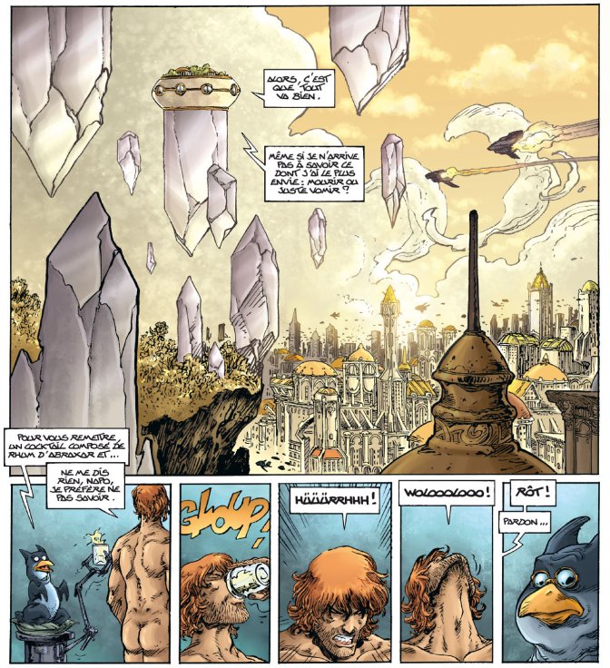 Heureusement, à l’issue de ce cycle en demi-teinte, Lanfeust et Hébus rentrent sur Troy, et ça, ça fait plaisir. On retrouve des personnages, des paysages, des problématiques qui agissent comme une madeleine de Proust, en plus drôle bien sur. Et puis, on ne va pas se mentir : on a beau savoir que le coup du "héros-qui-n’a-pas-vieilli-alors-que-des-années-se-sont-passées-en-réalité-chez-lui", c’est une ficelle scénaristique vieille comme le monde se rapprochant plus de la corde à nœuds que du fil de pêche, ça marche à tous les coups. On en écraserait presque une petite larmichette. Ajoutons à cela le "meurtre" commis par Lanfeust en début de cycle, et on a là de quoi faire sangloter dans les chaumières, tous les ans vers fin novembre, que ça soit d’émotion, ou, pourquoi pas, de rire.