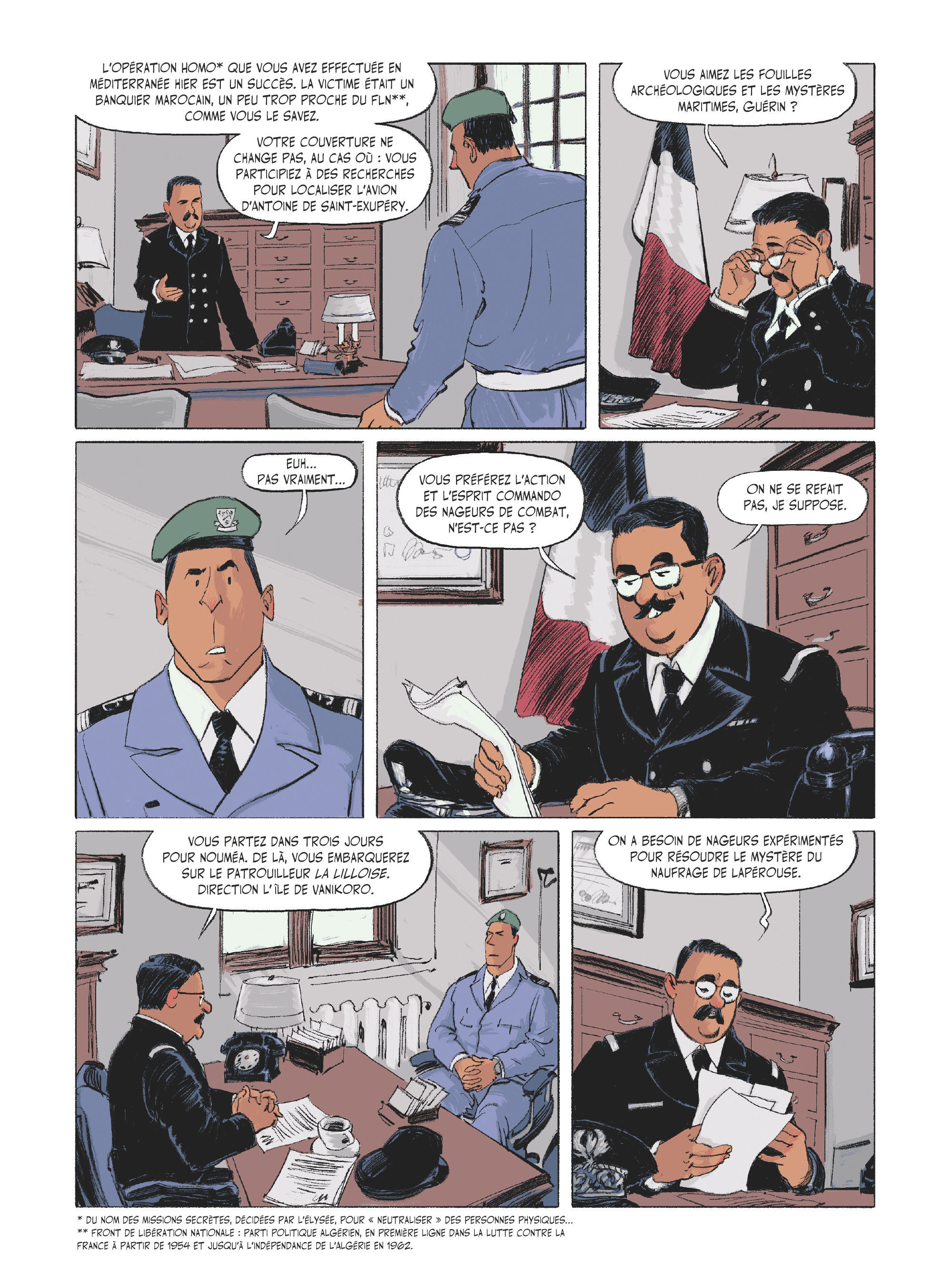 Résumé : Voilà près de 200 ans que le mystère de la disparition de La Boussole, la frégate de Lapérouse, hante la marine française. Le fameux navigateur mandaté par Louis XVI pour établir un ambitieux voyage de 4 ans dont les objectifs sont à la fois scientifiques, commerciaux et militaires, a disparu corps et bien avec son équipage au large de Vanikoro, dans les îles Salomon. En 1964, de nouvelles informations sur les restent convainquent la marine de lancer une expédition inédite pour retrouver l’épave du navire. À la tête de cette expédition figure le capitaine Durieux, grand amoureux d’histoire maritime, François Guérin, commando et spécialiste de plongée, et Viviane, une journaliste au caractère bien trempé qui doit réaliser un reportage pour la presse française. Arrivé sur place, c’est une véritable fièvre qui s’empare de l’équipage : le mythe de Lapérouse fait tourner la tête du capitaine, prêt à tout pour faire de l’expédition un succès, quand François Guérin, moins adepte d’histoire, se demande quel est le véritable intérêt de cette mission… Entre plongée en eaux profondes et périples dans la jungle, rien ne sera épargné à l’équipage dirigé par Durieux dans ce bout du monde au climat hostile…